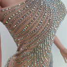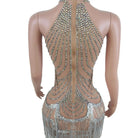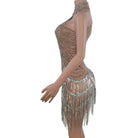 This A Great Performance Mini Dress is made of durable Spandex material and features a geometric pattern, sleeveless design, and above-the-knee length. It is further decorated with rhinestone and tassel details for a glamorous look. Perfect for special occasions.