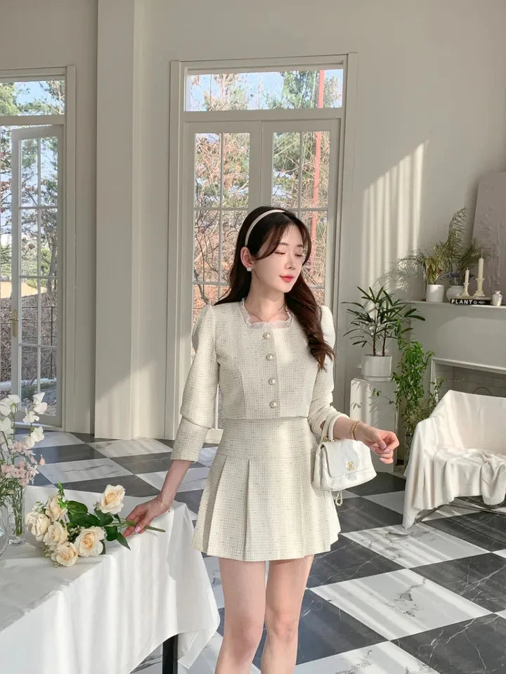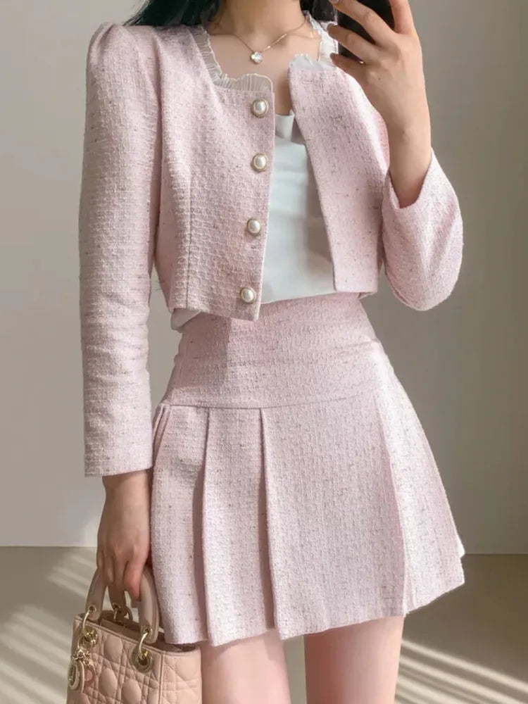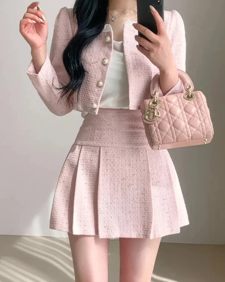 Experience the joy and comfort of our See You Smile Skirt Set! Made with a blend of cotton, polyester, and wool, this set is perfect for any occasion. The single-breasted closure and regular sleeve style add a touch of elegance, while the pleated silhouette creates a flattering look. With charming button details and a solid pattern, you'll be smiling all day long!