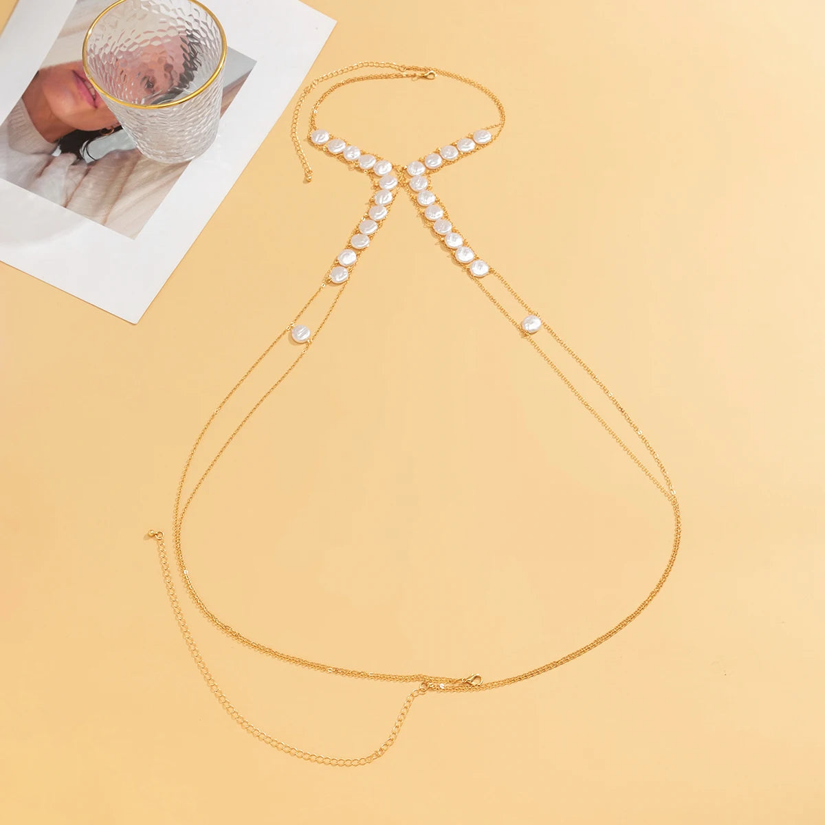 The It's About New And Me Body Jewelry features a one-of-a-kind pearl body jewelry design for an elevated and unique look. Crafted with durable and lightweight materials, the body chain adds a touch of sophistication to any outfit.