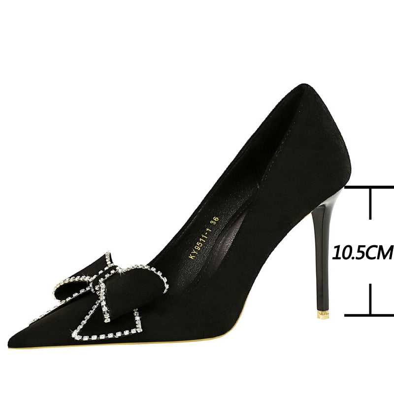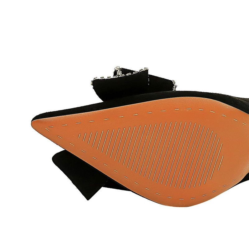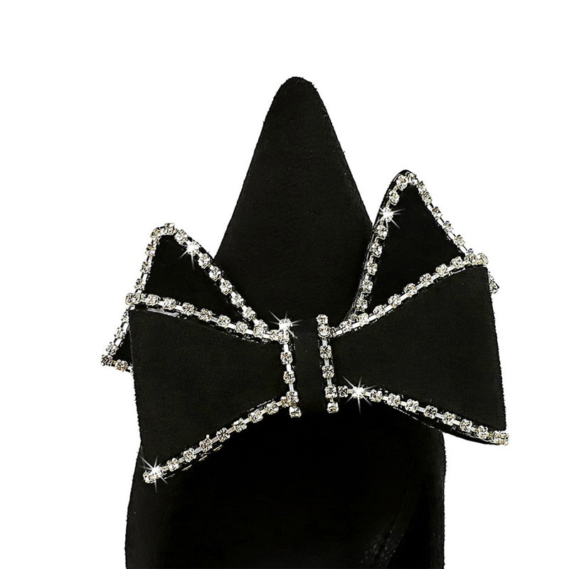 These Anything But Ordinary Stilettos come in classic black with a creative twist. Enjoy a flock-covered stiletto silhouette, adorned with an intricate bow and rhinestone decoration for added flair. Be extraordinary in your style with these unique stilettos.