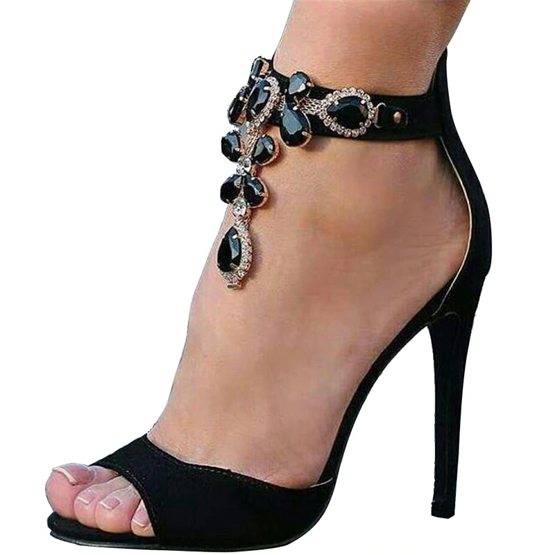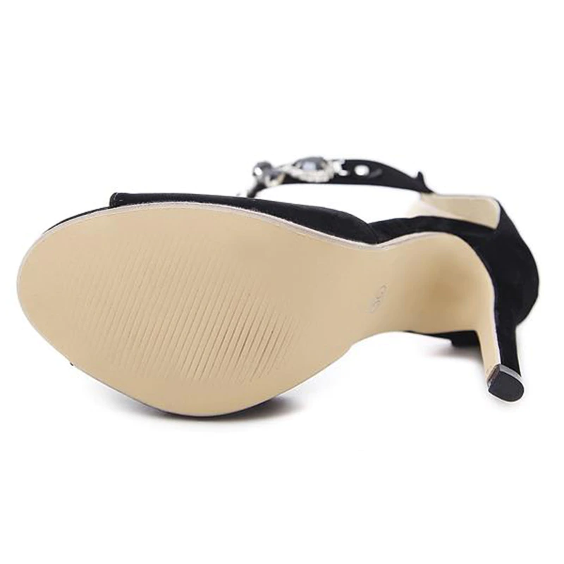 Close-Heeled Open-Toed Flock Stiletto with Gemstones Decorated Ankle Strap