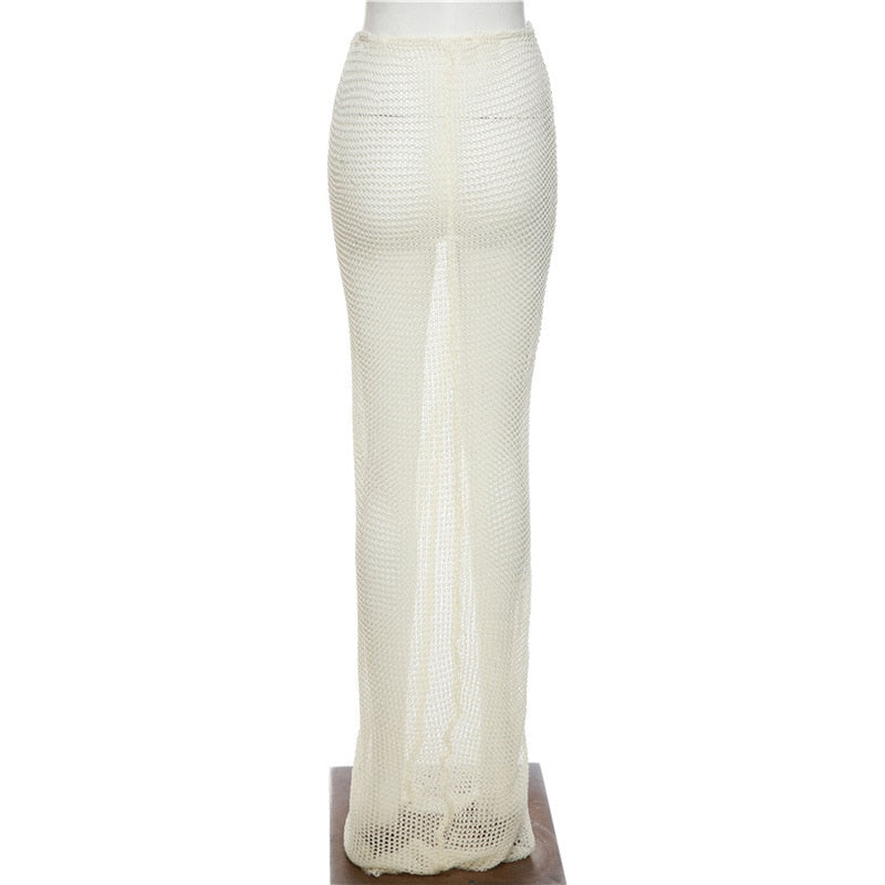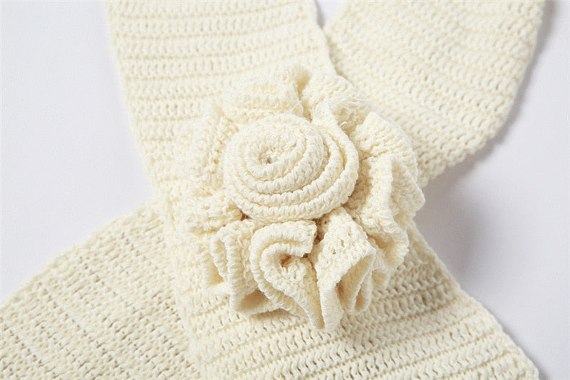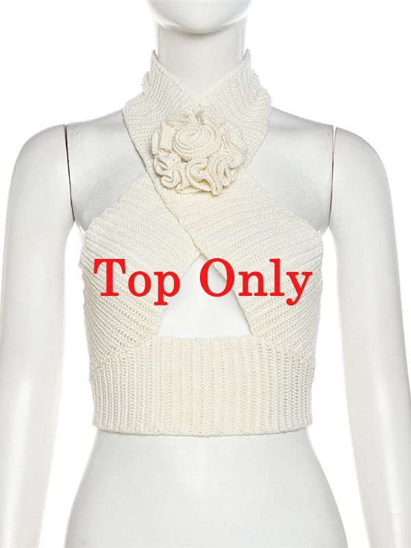 This two-piece top and skirt set crafted from beige-knitted fabric features a wrap-style crop top and a long sarong-style skirt, complemented by floral appliqués. A unique and modern look, while maintaining a sophisticated and timeless style. Perfect for special occasions and events when you want to make an impact.