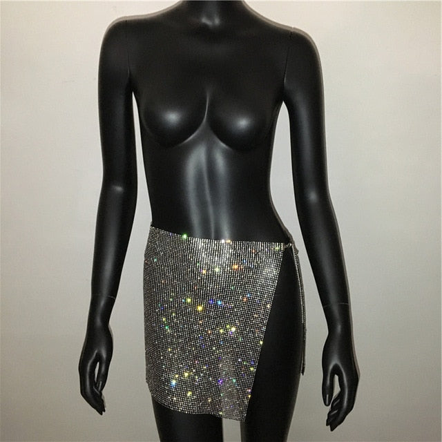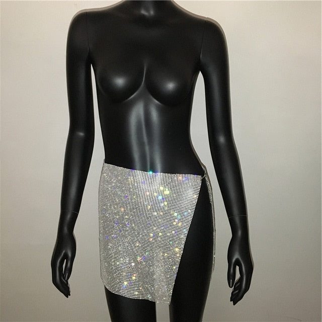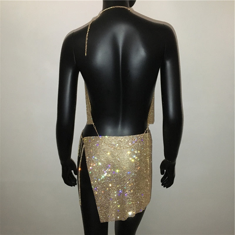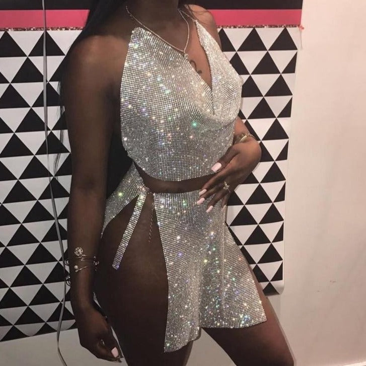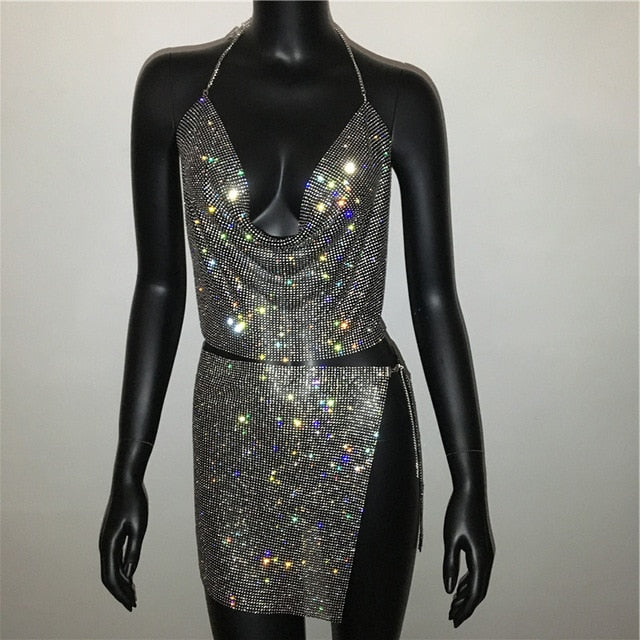 Sequins Decorated Sleeveless V-Neck Collar Polyester Skirt Sets with Drawstring Closure