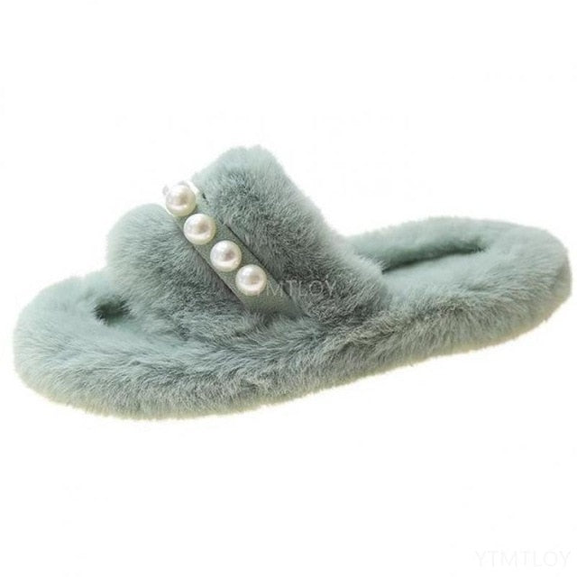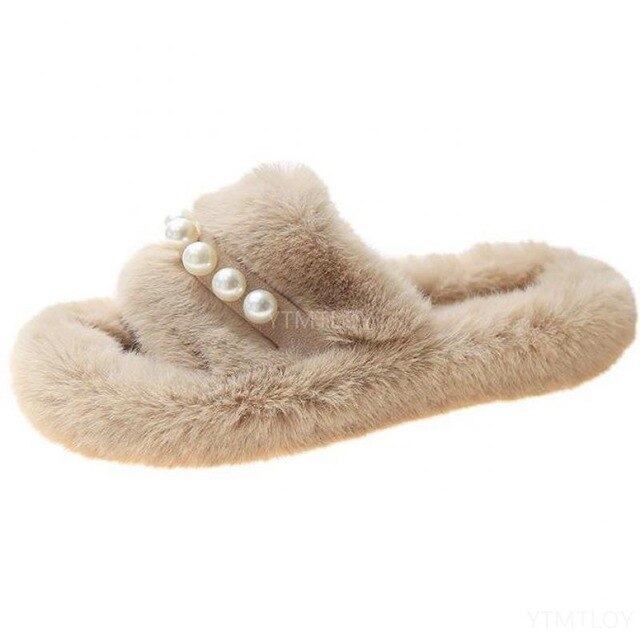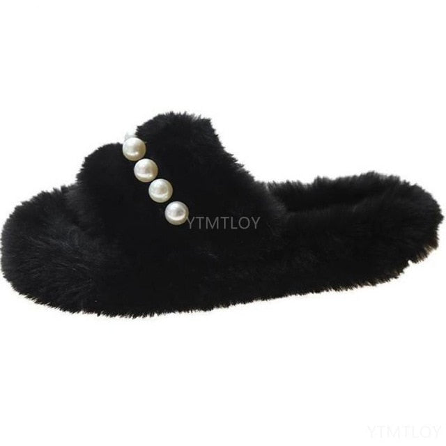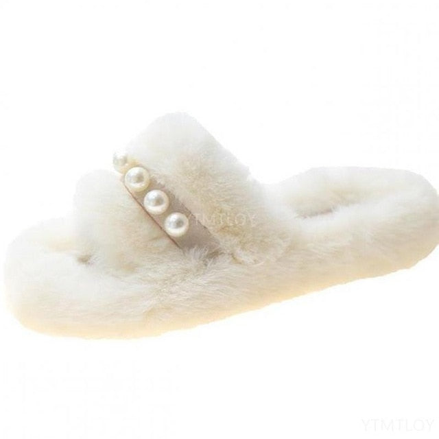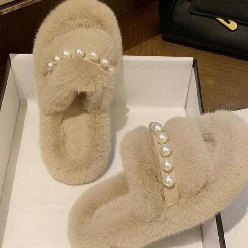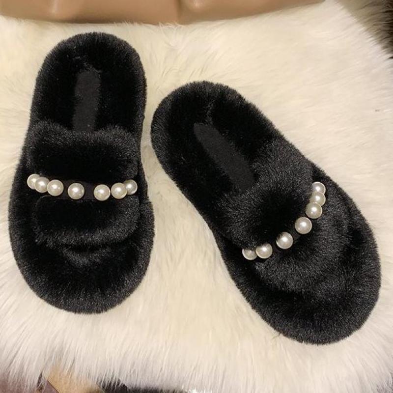 Solid Fur Slipper Sandal with Pearl Decoration, Fleece, Flock, Rubber, and PU Material