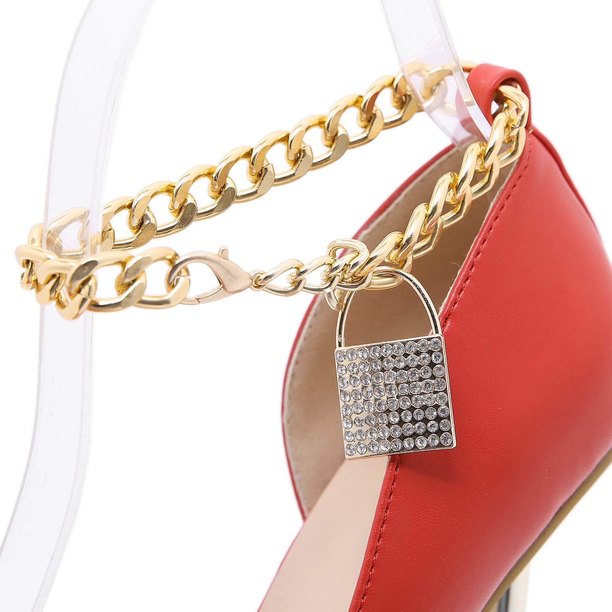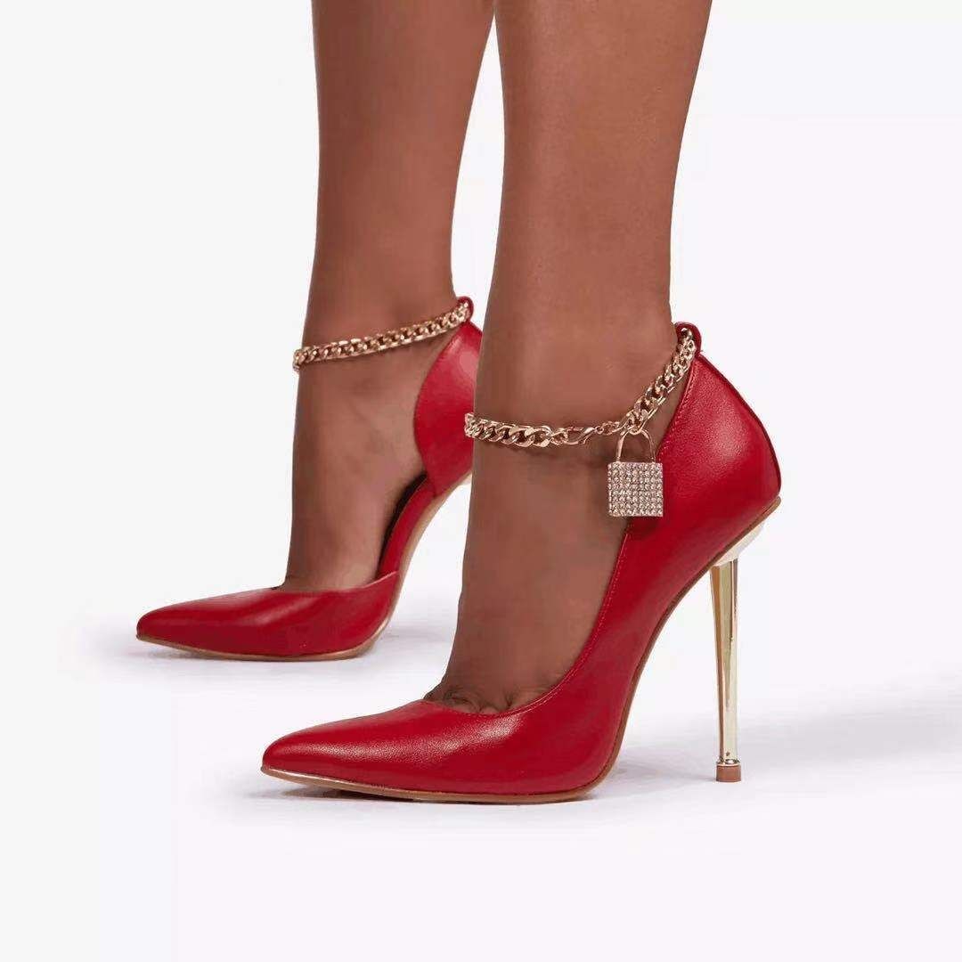 Looking for a unique way to make a statement? Look no further than this chain ankle strap stiletto. This pointy-toe design is the perfect way to add a touch of glamour to any look. A stunning lock-charm ensures this style is a must-have for any occasion.