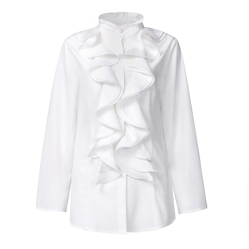 Join the trend and masquerade in style with this dazzling ruffled shirt. This elegant piece shows off a trendy ruffled design in black or white. The feminine colors correspond with so many other accessories and outfits. The classic, ladylike style of this top is sure to have you looking like a million bucks. Look and feel your best with this impressive and stylish shirt. This ruffled shirt is the perfect way to finish your look.