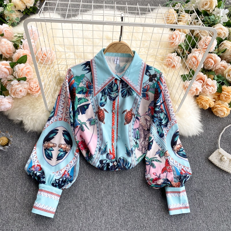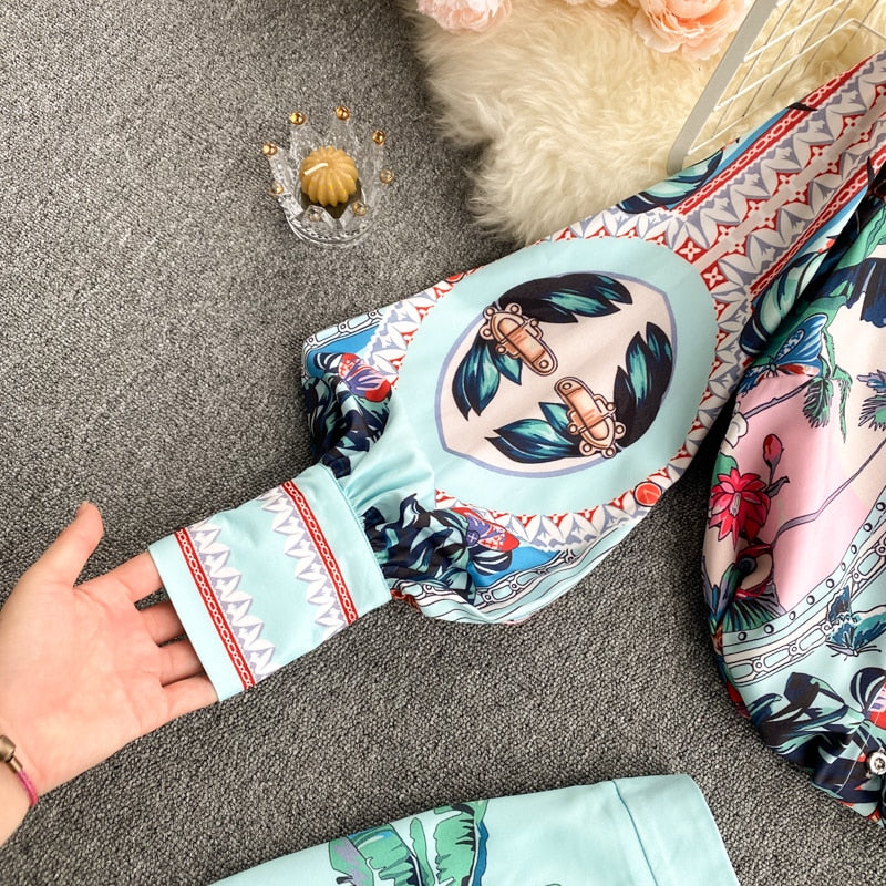 Lantern Sleeve Shirt and Elastic Waist Skirt Sets with Tropical Print Pattern
