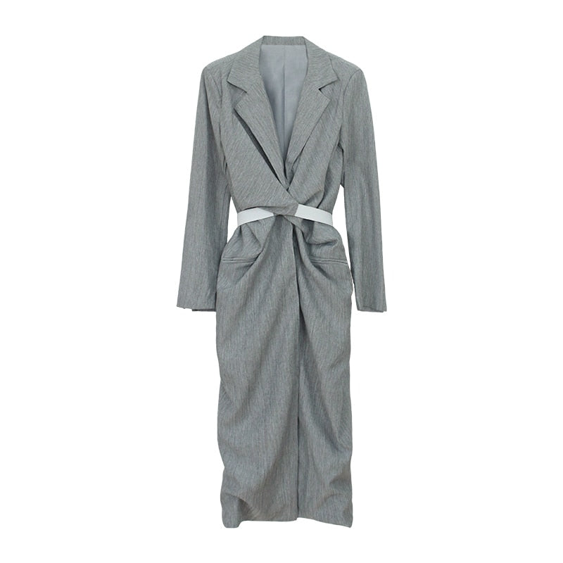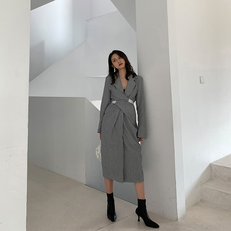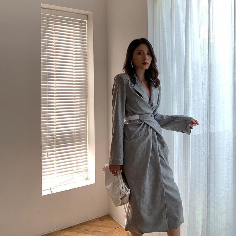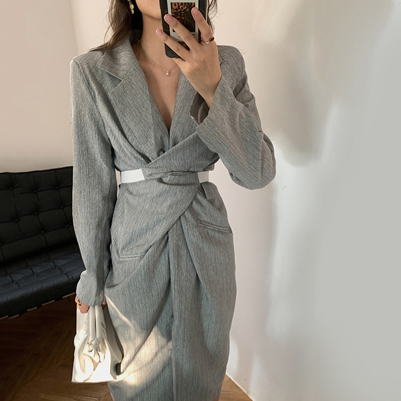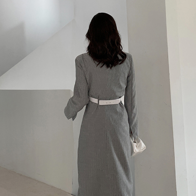 V-Neck Midi Dress with Long Sleeve, Belt Decoration, and Cotton Polyester Material