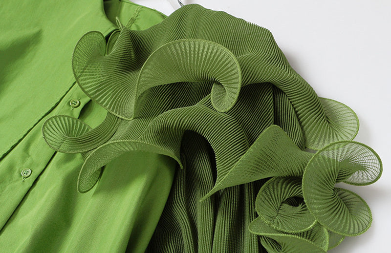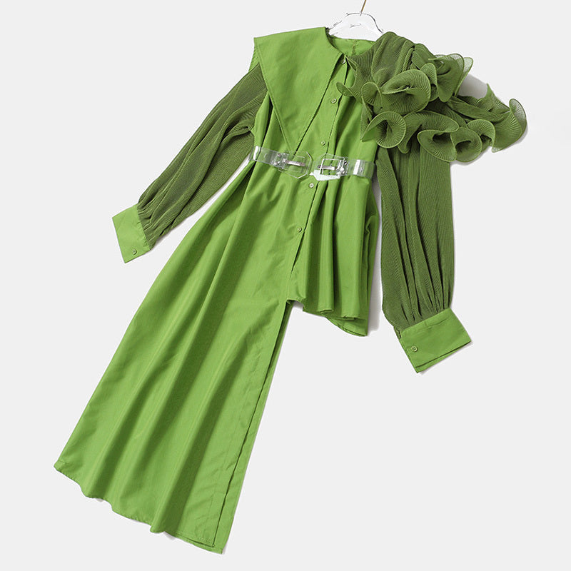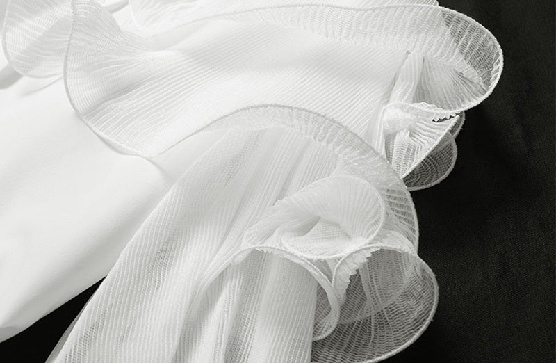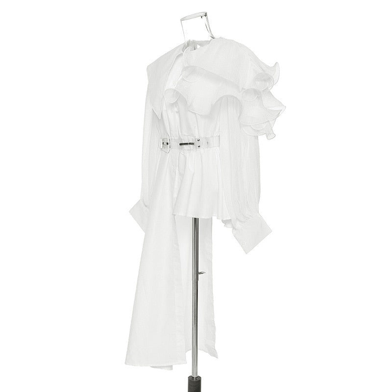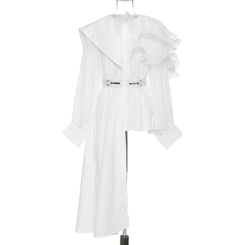 This asymmetric shirt is a fun and easy way to set a stylish tone. It gives a casual yet feminine look that can be worn with Jeans or Khakis. The big turn-down collar adds uniqueness. The ruffle trims give a sweet and feminine touch to a simple shirt. The long sleeves make it a go-to item that is great for any season.