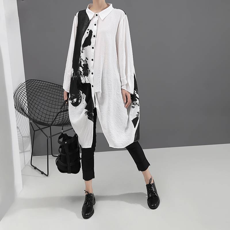 Long Loose Shirt with Turn Down Collar, Abstract Print Pattern, Single Breasted Closure, and Cotton Rayon Material