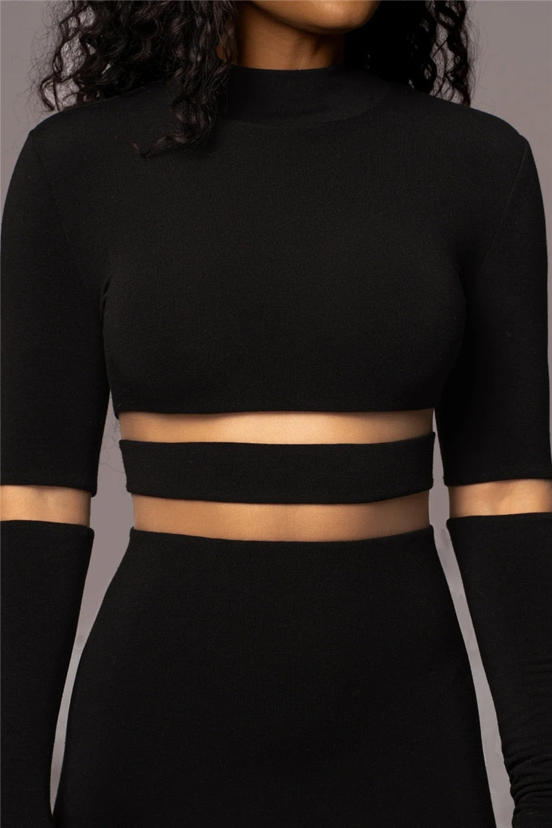 This midi dress is the perfect choice for an elegant yet edgy look. Constructed with solid fabric and detailed with a see-through mesh patchwork, this dress features long sleeves and a midi length for a classy and sophisticated finish.