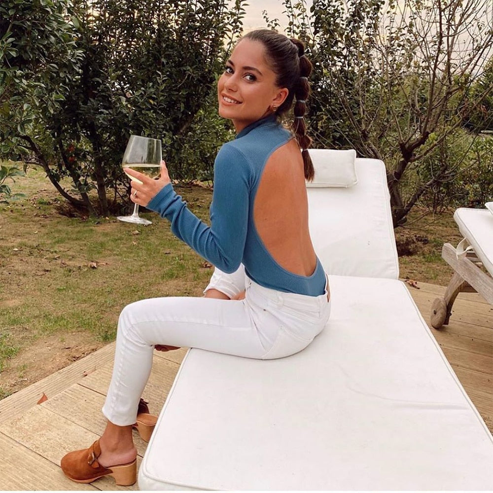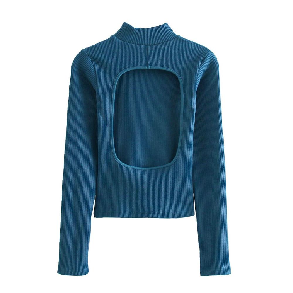 Backless Blue Knitted T-Shirt with Turtleneck Collar and Polyester Material