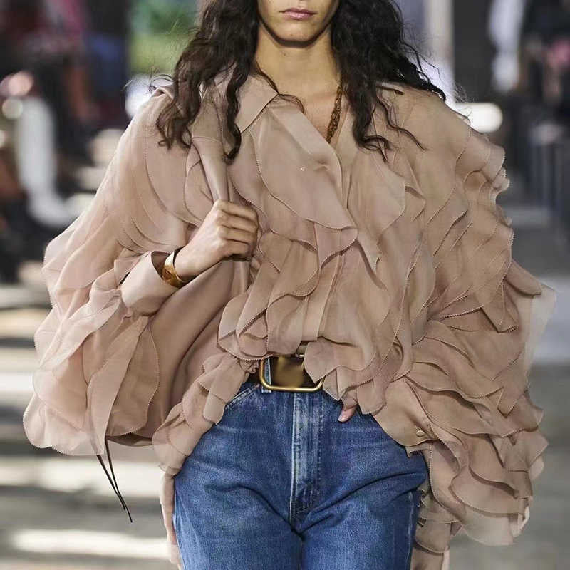 Long-Sleeved Turn Down Collar Blouse with Drape Patchwork Decoration