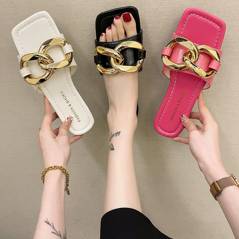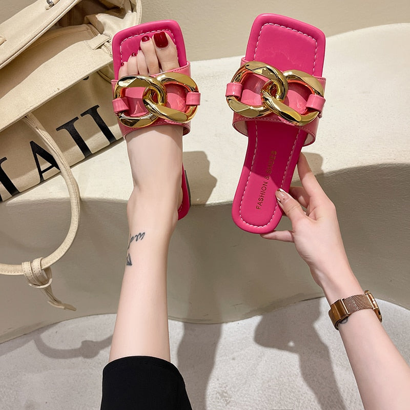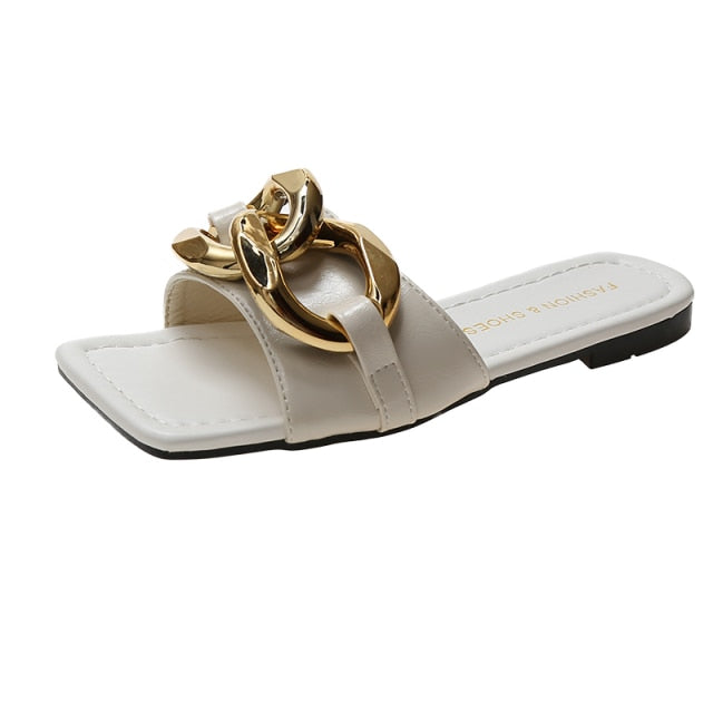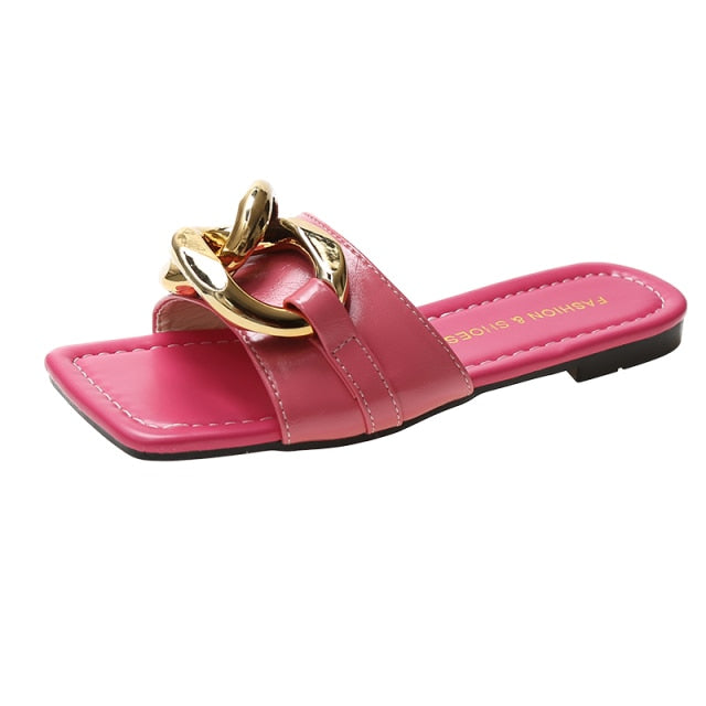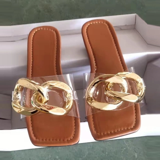 The hot new trend in sandals this summer is these striking, chain embellished sandals. They are made of PU materials and are durable enough to last through the summer and beyond. The sole is comfortable. The chains give these sandals a stylish edge that can be worn with any outfit. The perfect accessory for any occasion.