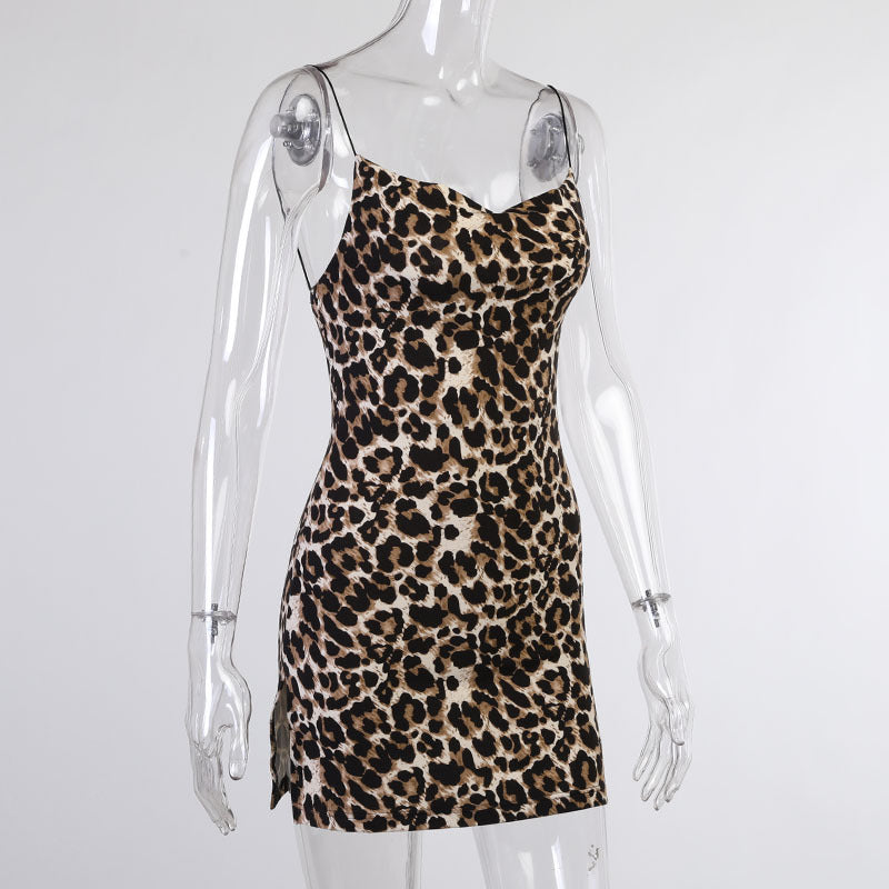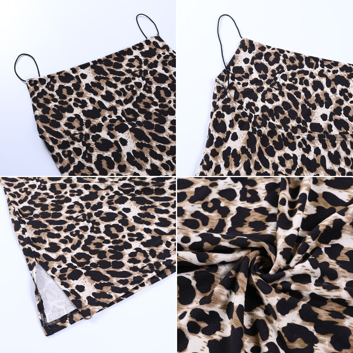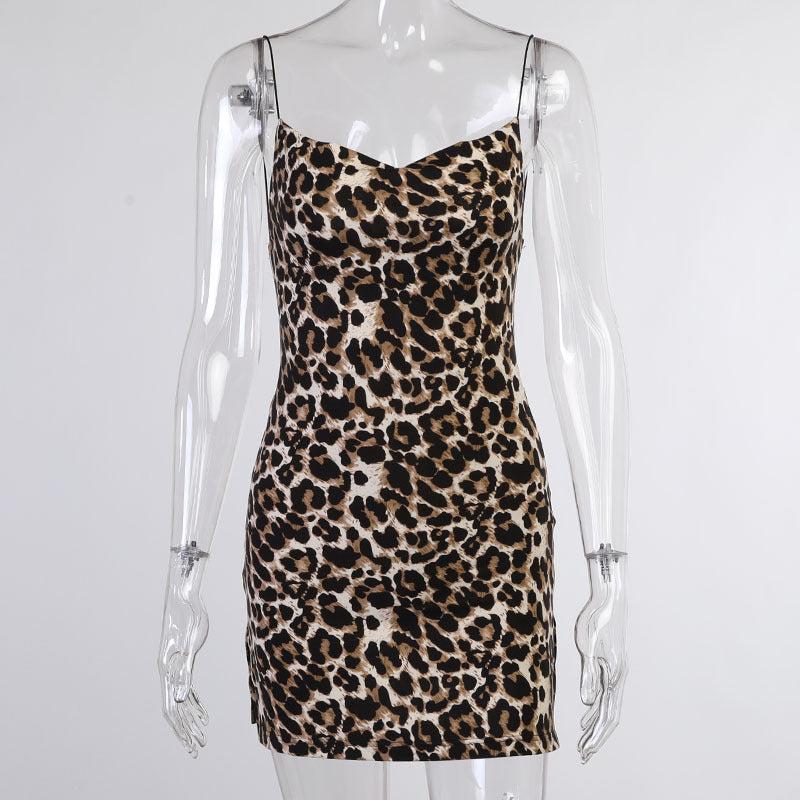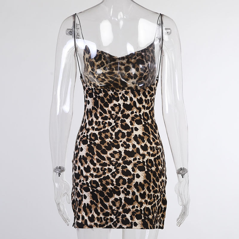 Leopard Patterned Mini Dress with Spaghetti Straps and Polyester Material
