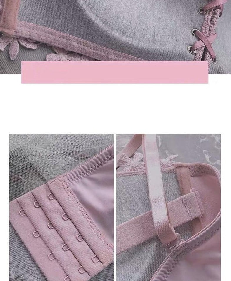 Non-Wire Push-Up Bra with Floral Embroidery, Lace-Up Decoration, and Polyester Material