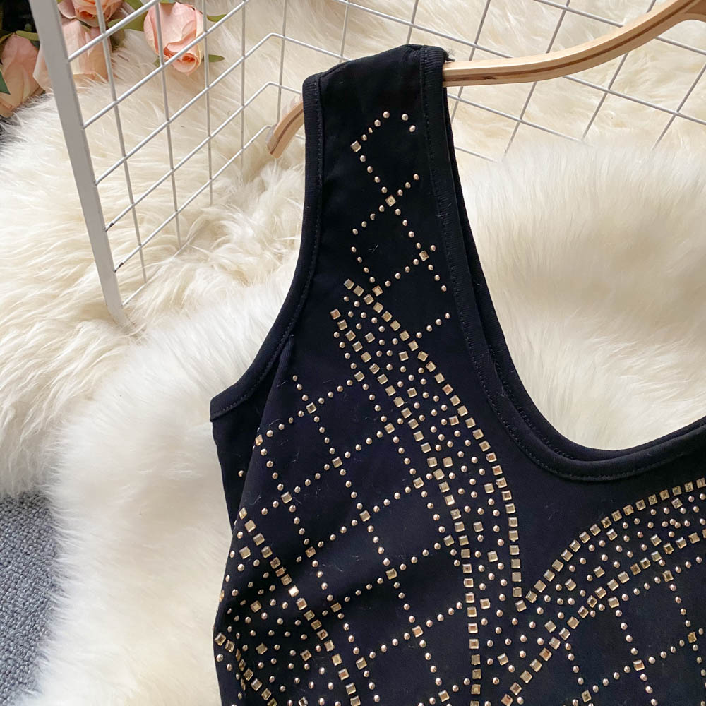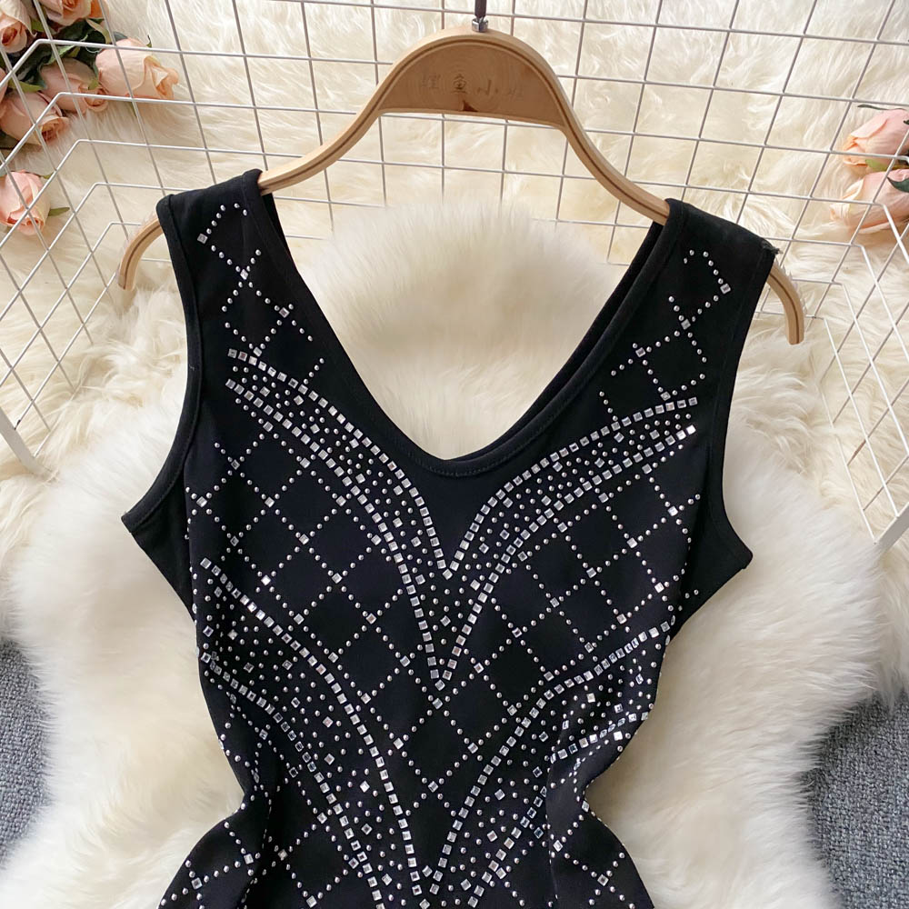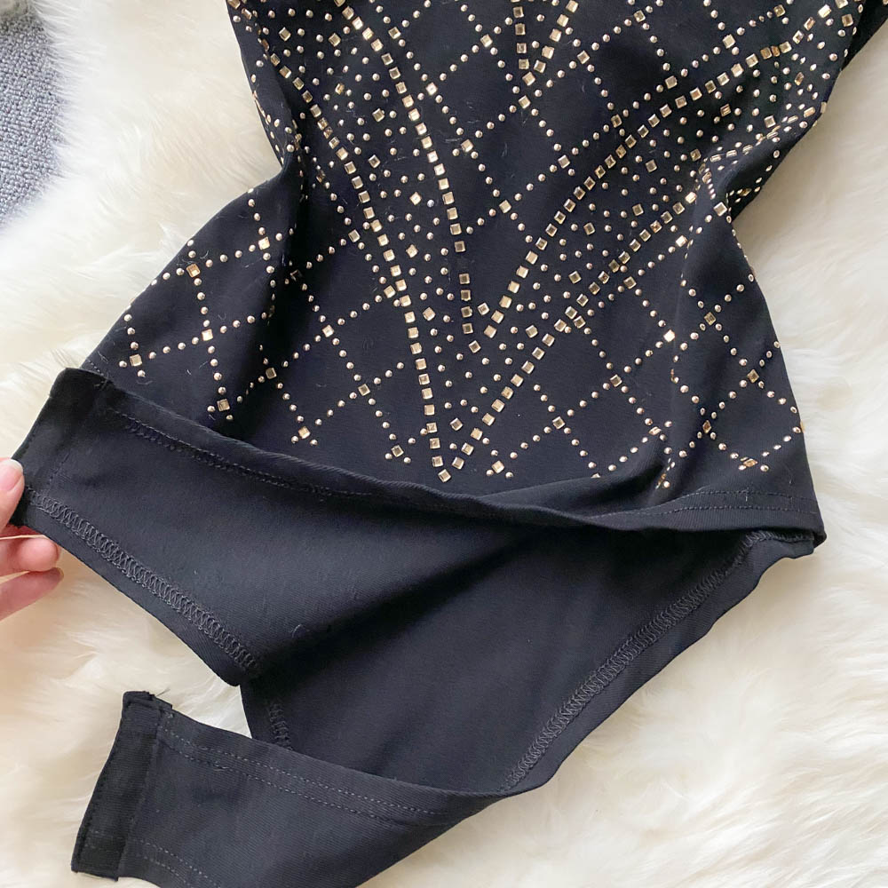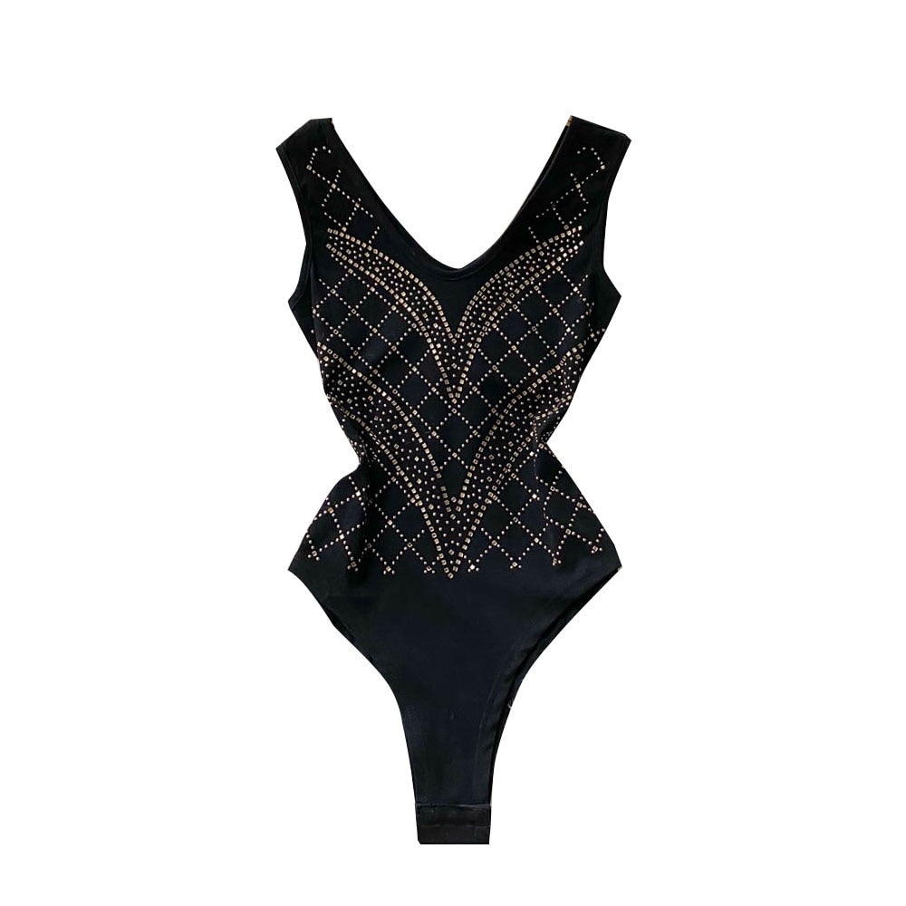 You'll love how effortless it is to slip into this stylish bodysuit. The loosely cut v-neckline allows for maximum comfort when you're on the go. The stretchy fabric is designed to be comfortable and easy to move in. A geometric rhinestone pattern gives it an eye-catching flair.
