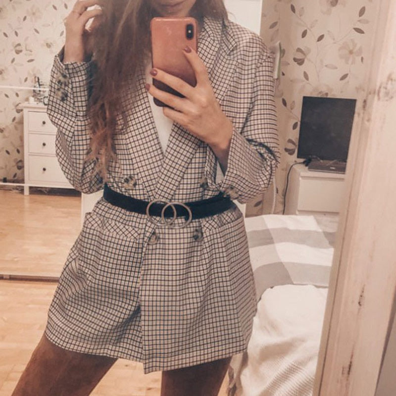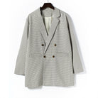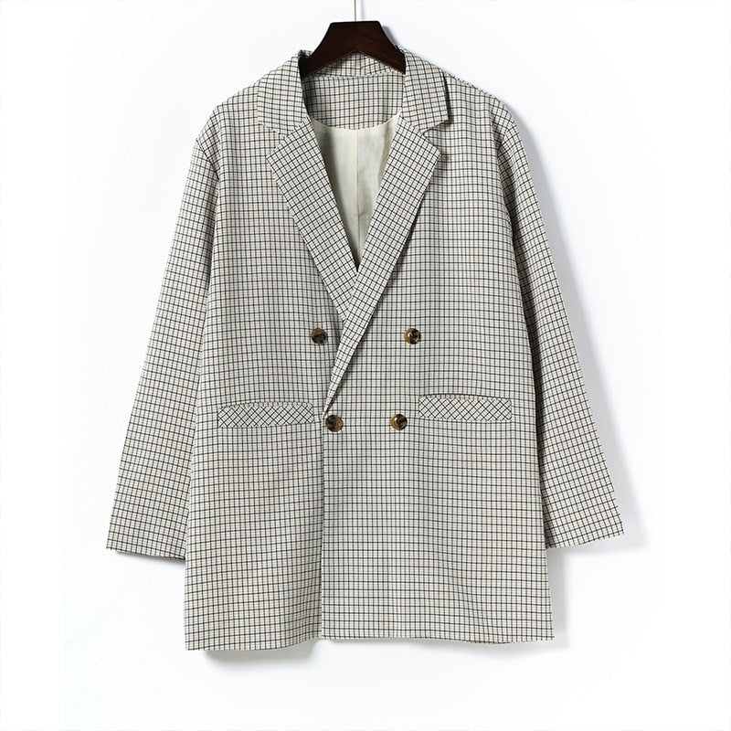 Doble Breast Closure Blazer with V-Neck Collar, Pocket Decoration, Plaid Pattern, and Polyester Material