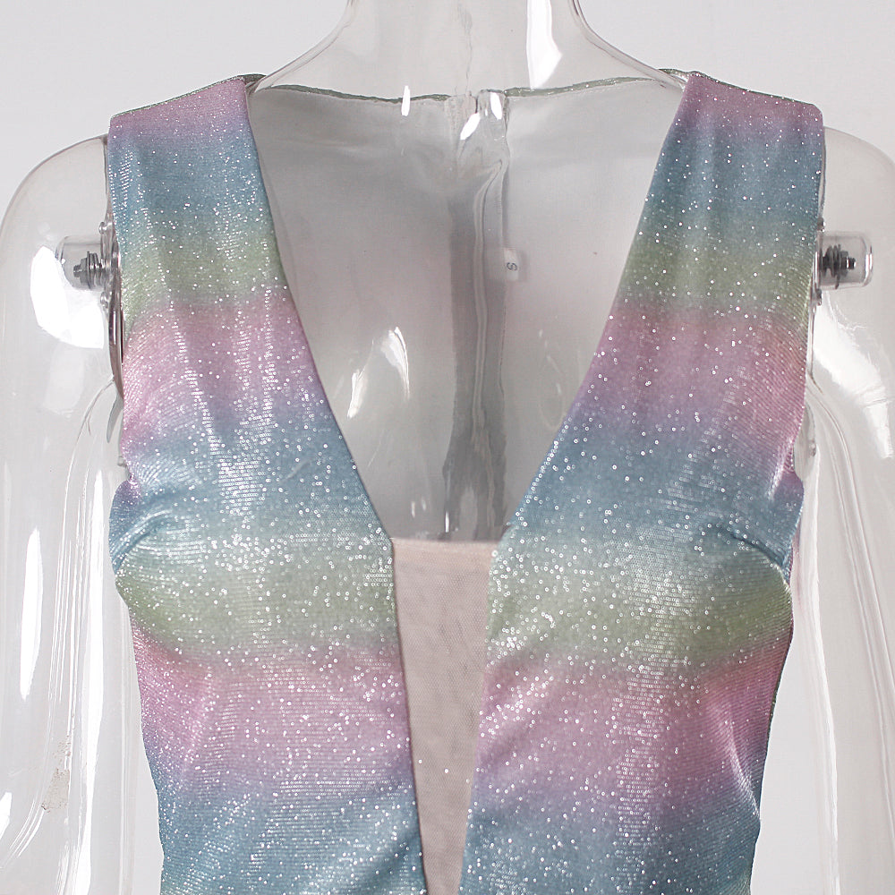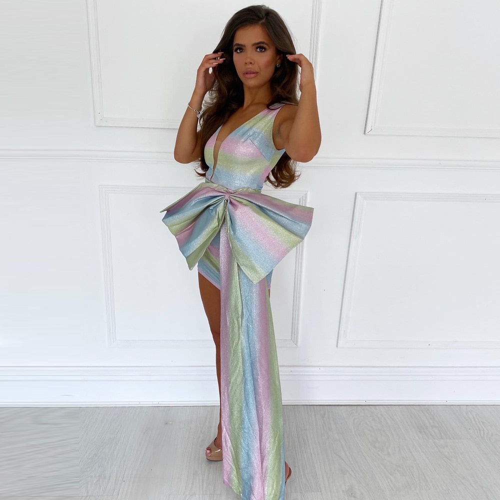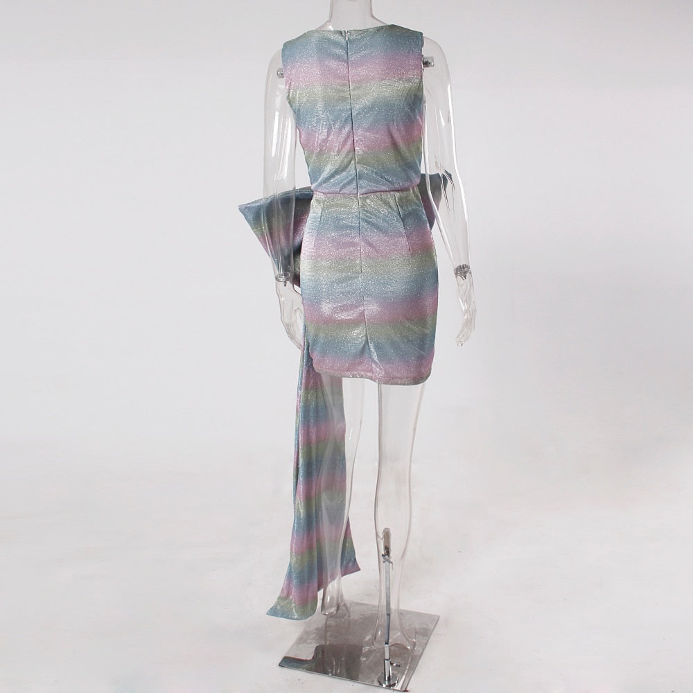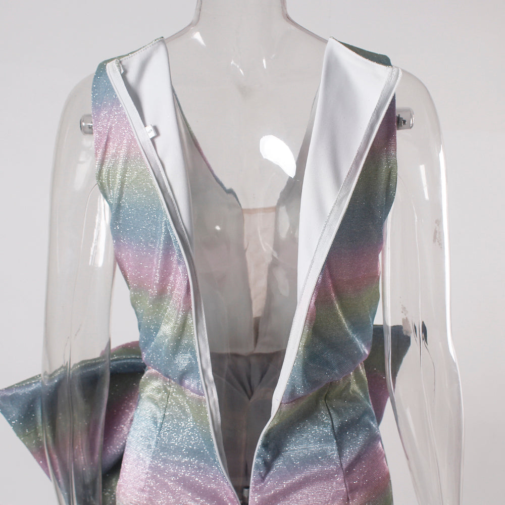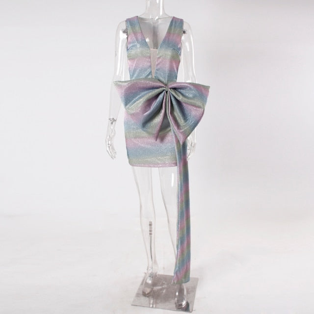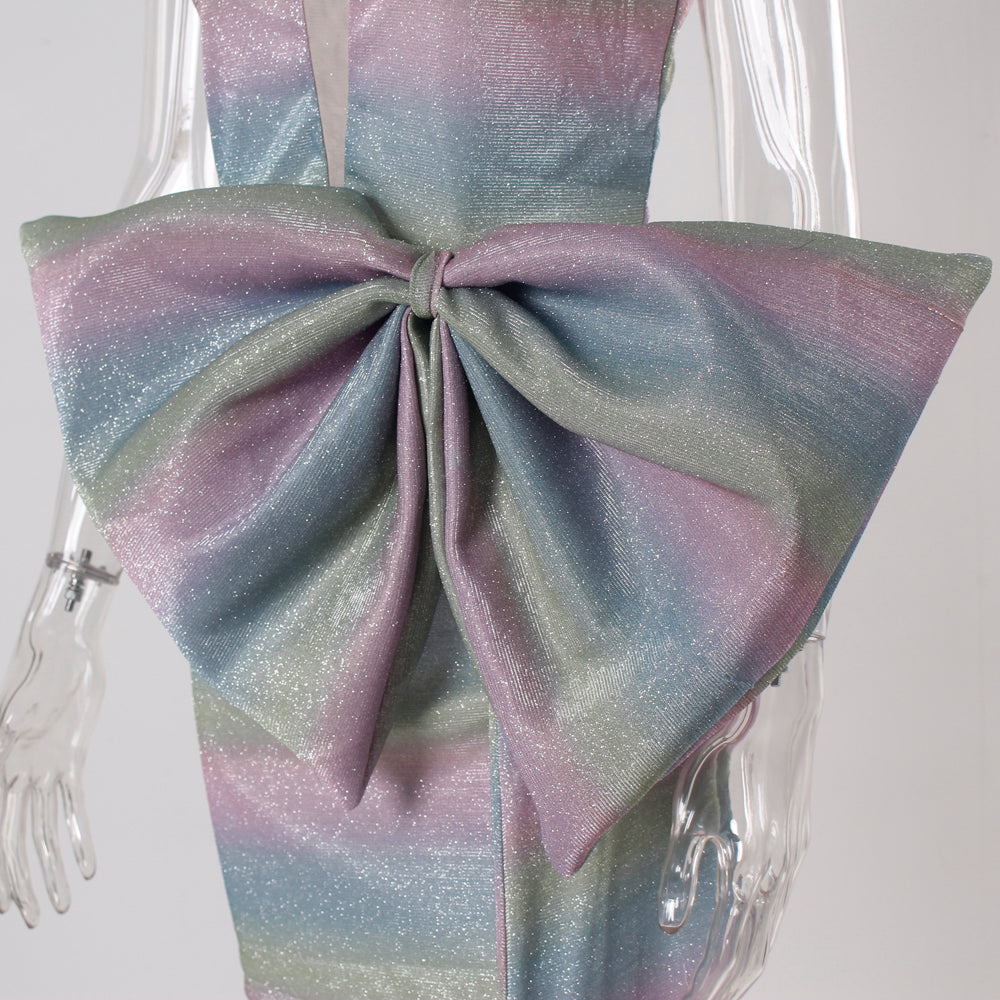 Shimmering Sleeveless Polyester Mini Dress with Colorful Ombre and Big Bow Applique