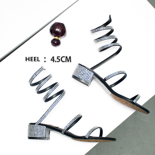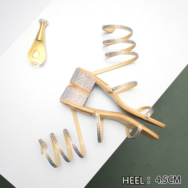Rhinestone Decorated Silk Low Heeled Sandal with Spiral Mid-Calf Wrap