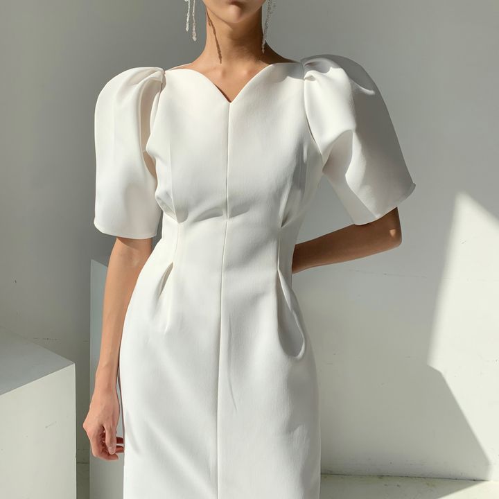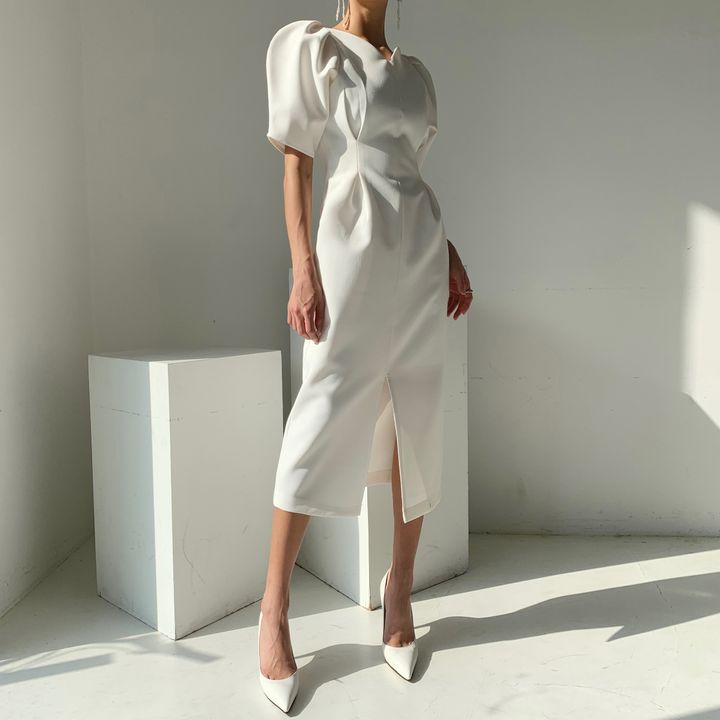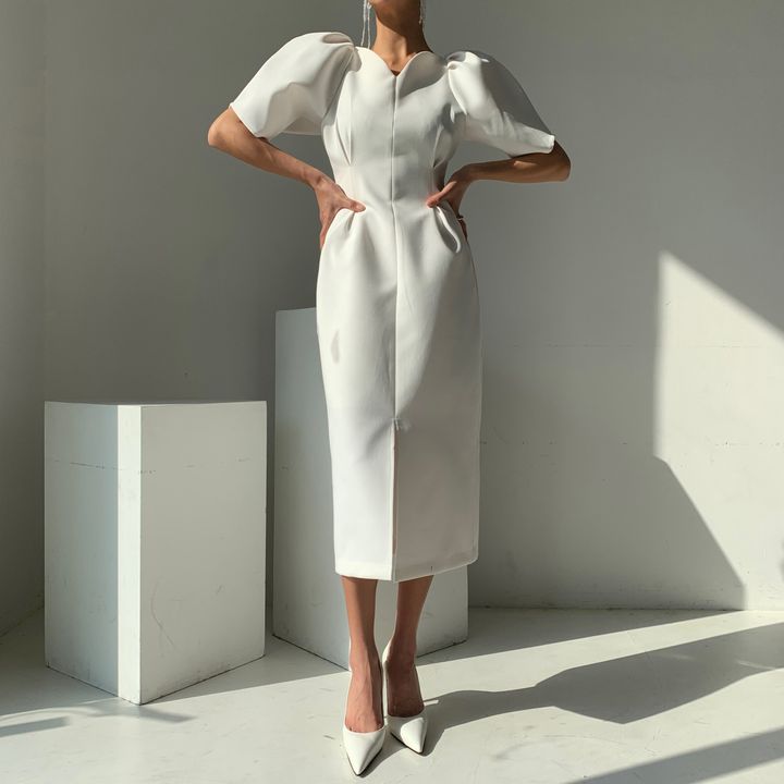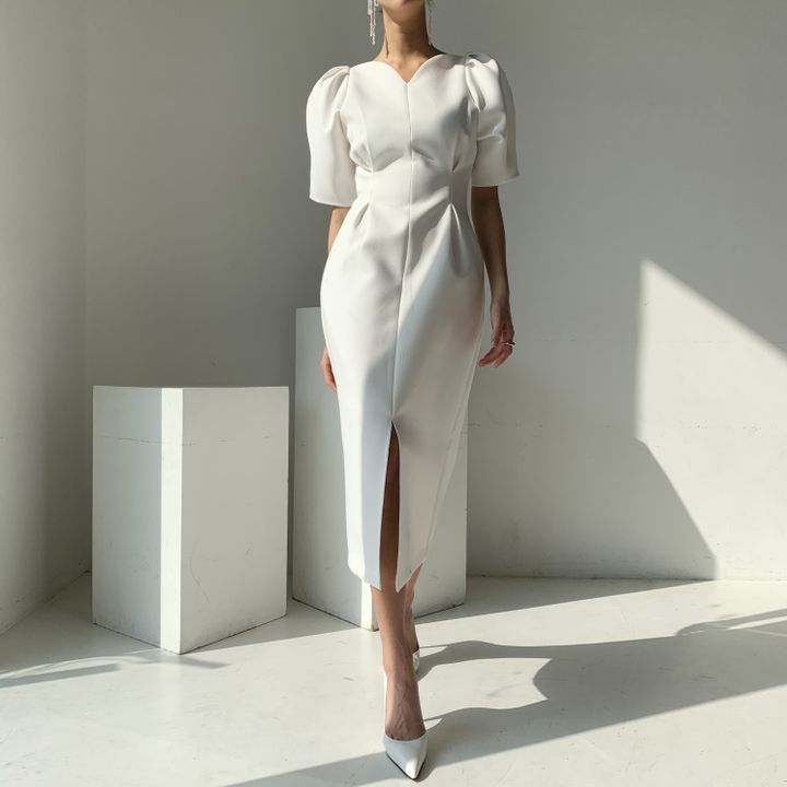 This stylish midi dress is the perfect choice for any occasion. Made from a comfortable polyester fabric that features a v-neck and short puff sleeves. The versatile style also works well with matching accessories.