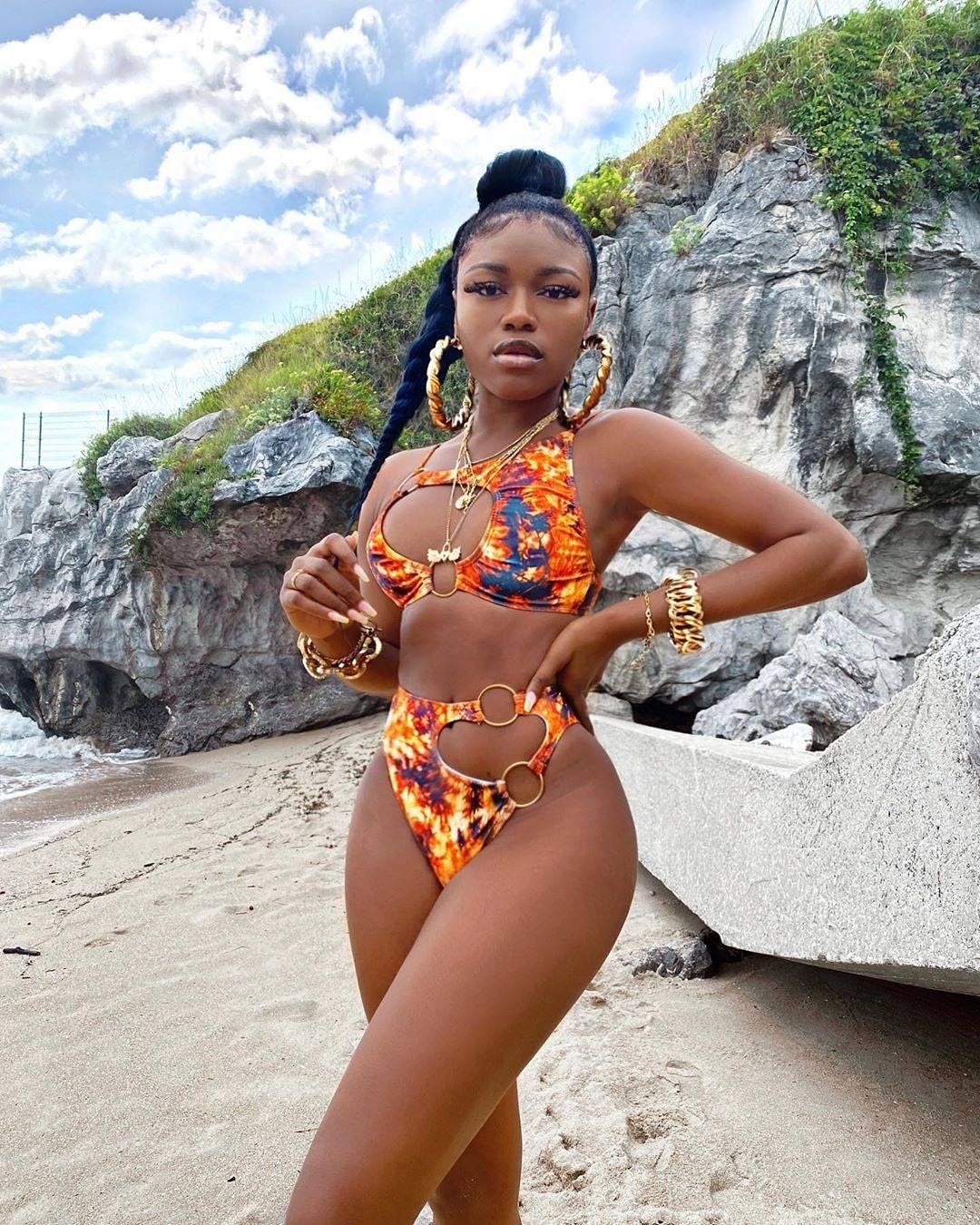 Show off your summer tan in this beautiful bikini. This two-piece bikini is full of colorful patterns with a cut-out design on the top and bottom. A fun bikini that is perfect for any summer vacation.