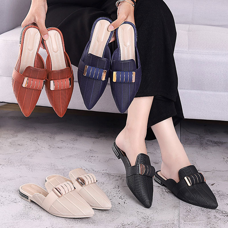 Casual Pointed Toe Square Heels with Stripped Metal Decoration Women Flat Shoes