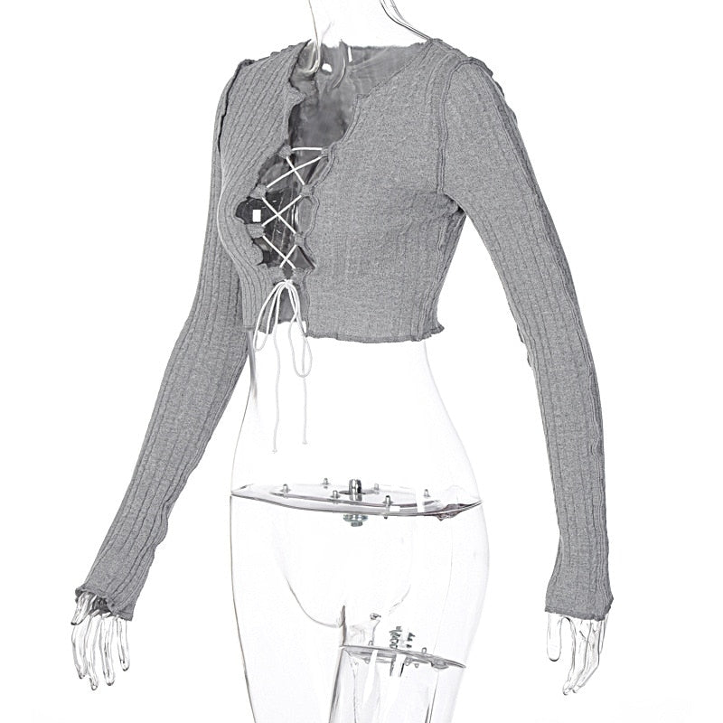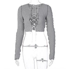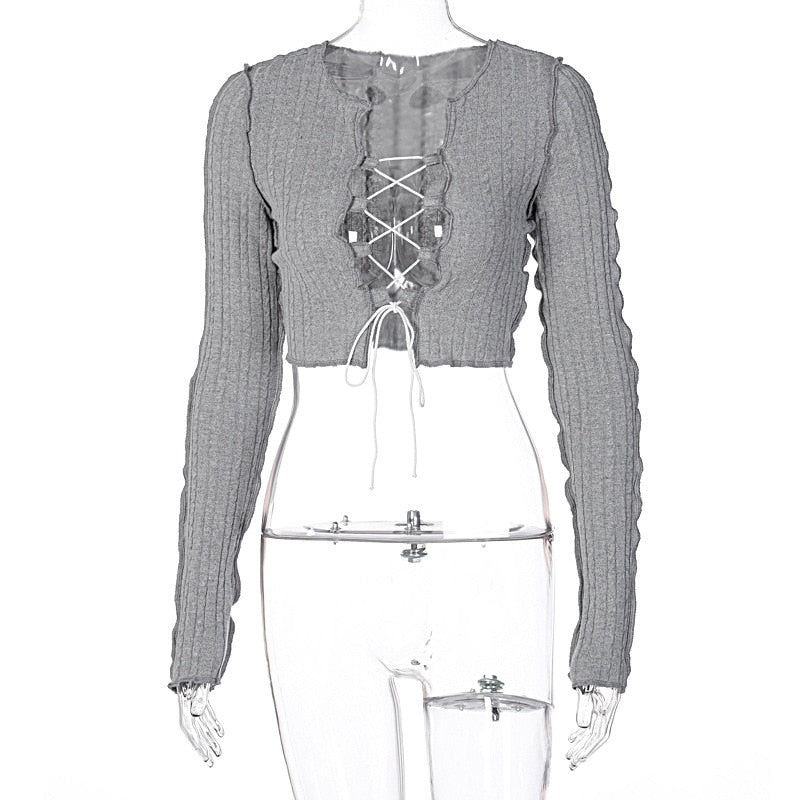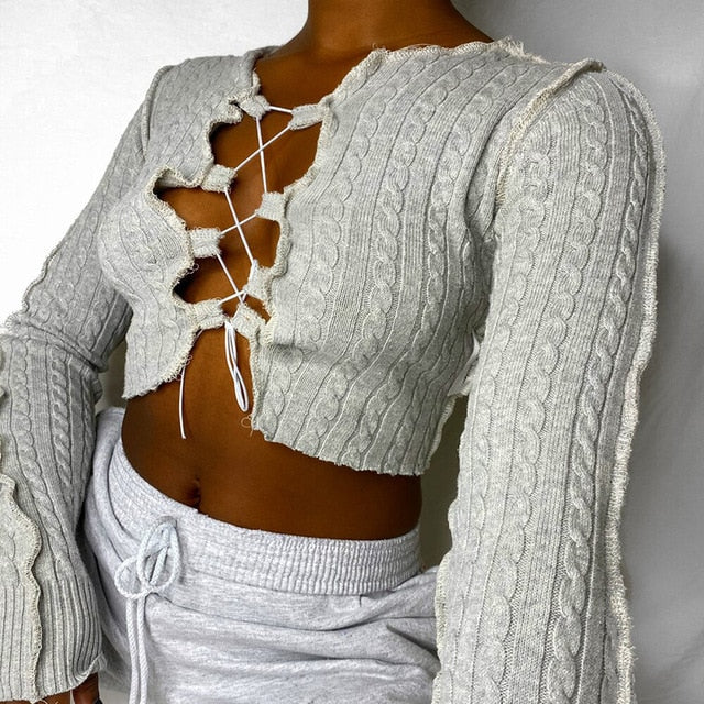 Solid Pattern Knitted Crop Top With Hollow Out Decoration, O-Neck Collar, Long Sleeve, And Polyester Material