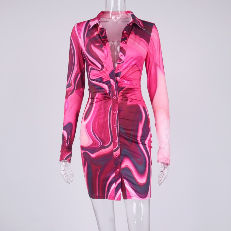 This colorful long-sleeved mini dress has a modern style that is sure to be a crowd-pleaser. The tie-dye pattern is an eye-catching feature that is sure to get noticed by all. The turn-down collar gives off a relaxed feel that is sure to make you feel comfortable and stylish. The single-breasted closure down the front is a practical detail that keeps the dress from slipping forward.