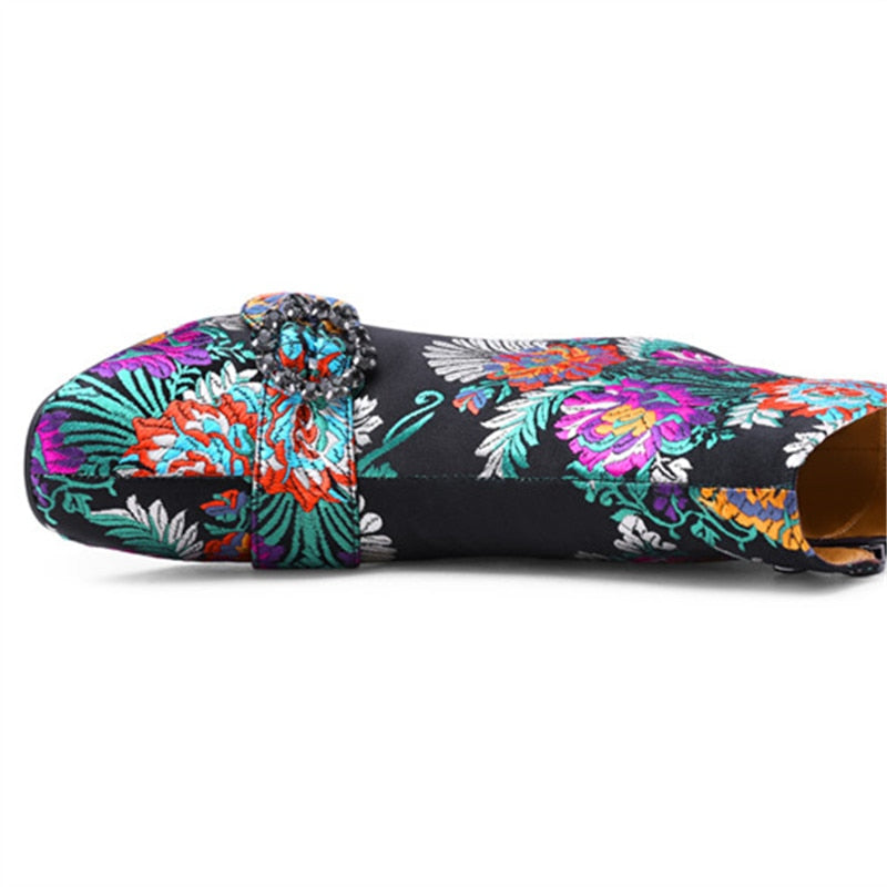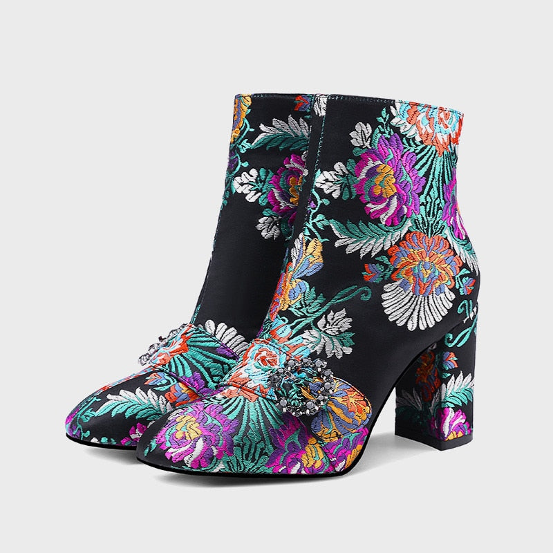 Square Toe Ankle Boots with Floral Pattern, Zipper Closure, and Silk Upper Material