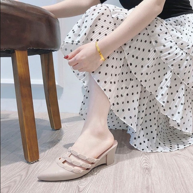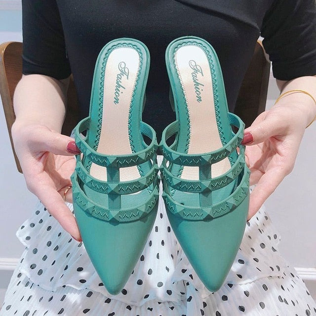Fake Rivet Decorated Solid PVC Mules Sandal with Flat Heel