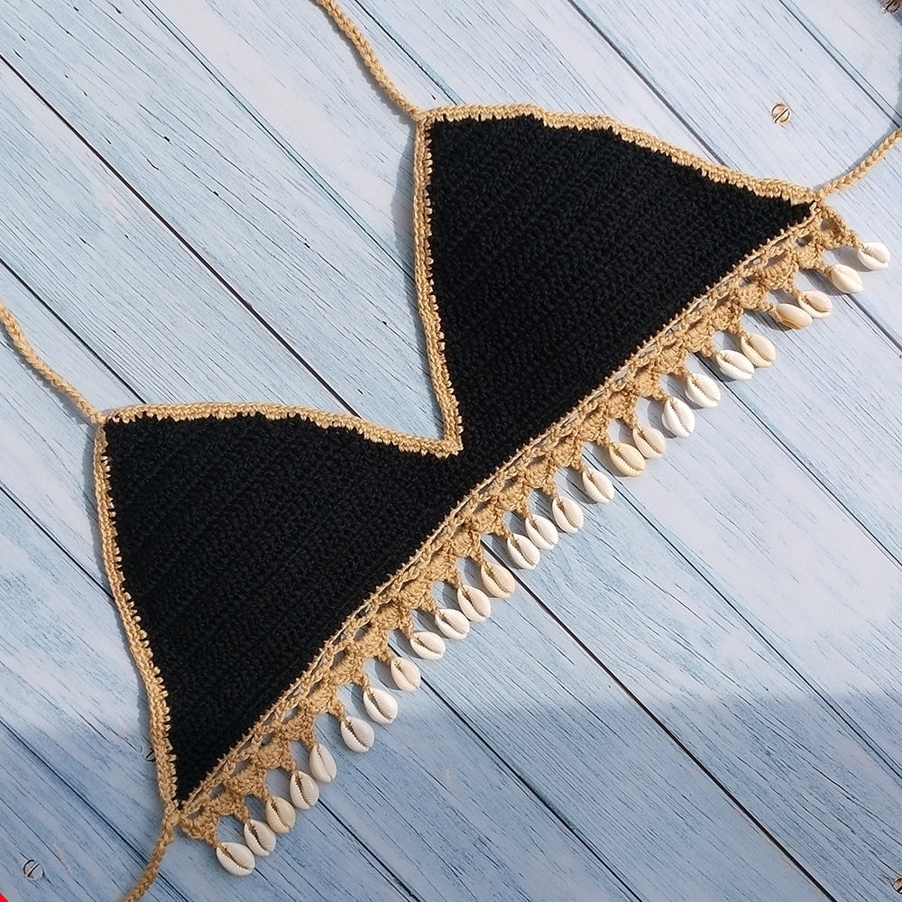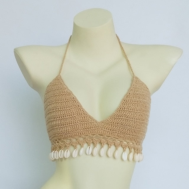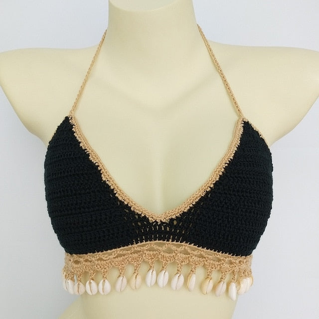 Solid Crochet Bikini Top with Tassel Decoration and Cotton Material