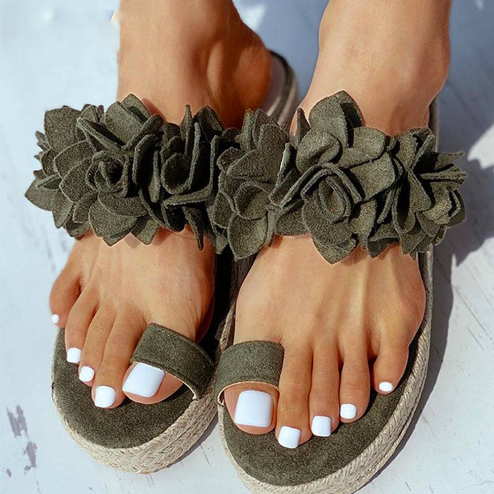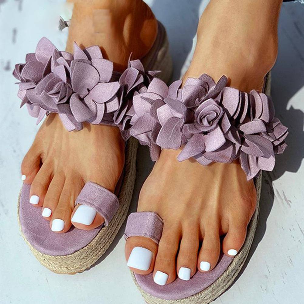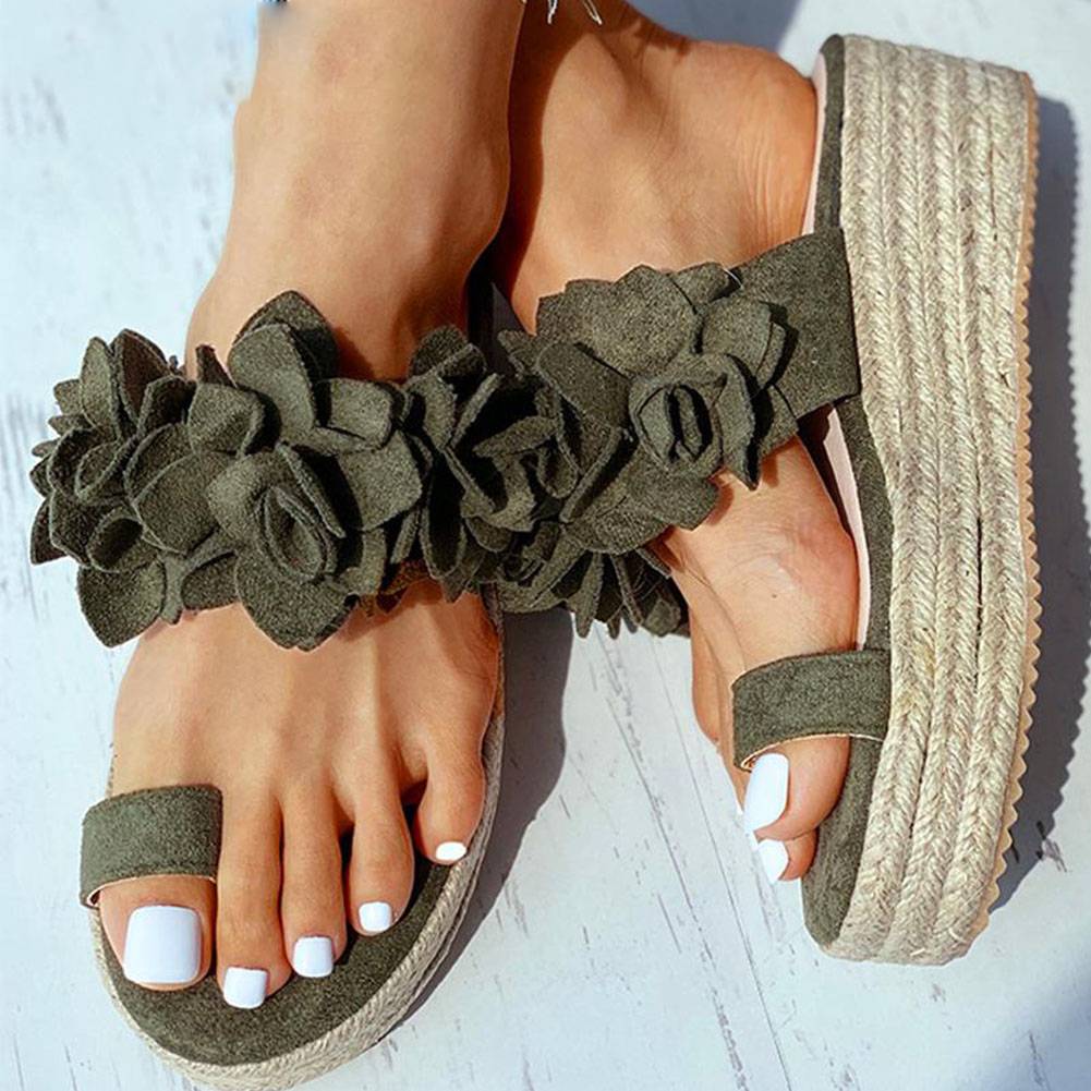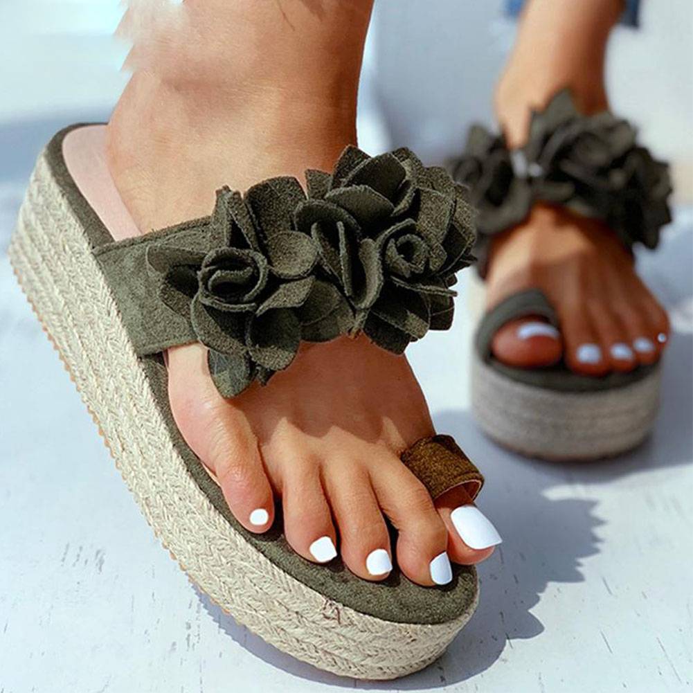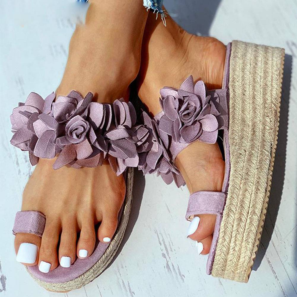 Platformed Flock Wedge Sandal with Floral Strap Decoration