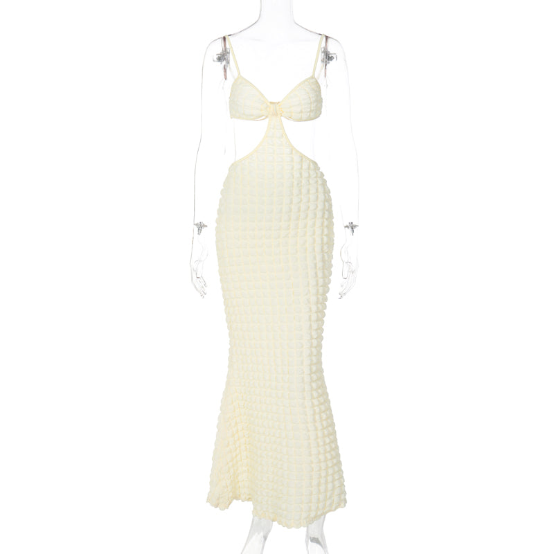 Elegant and versatile, this dress is perfect for any occasion. It features a knitted, spaghetti strap, and hollow-out design. It's a long dress made from polyester and would be perfect for any season.