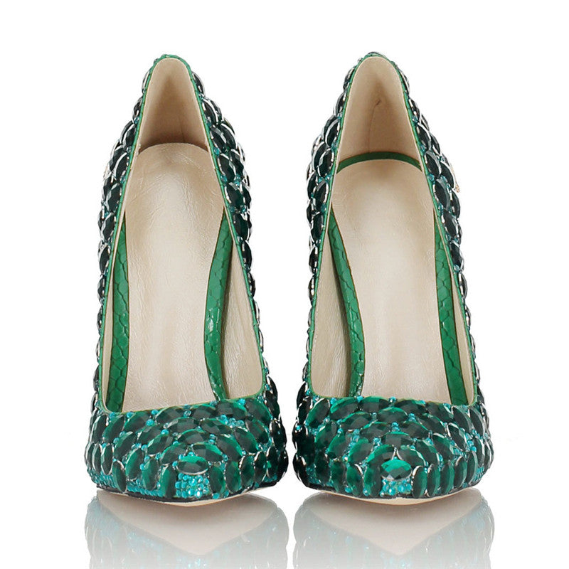 Genuine Leather Metal and Crystal Decoration Thin Heels Stiletto
