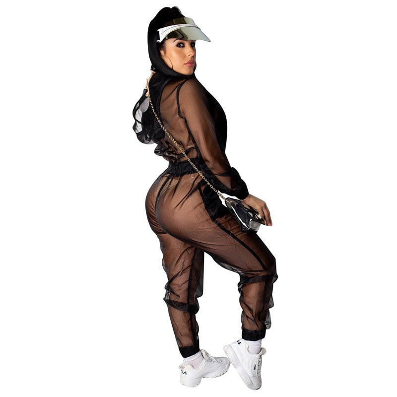 Full See-Through Polyester Jumpsuit with Long-Sleeved, Pocket, and Hoodie