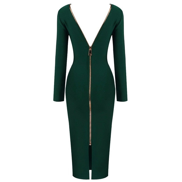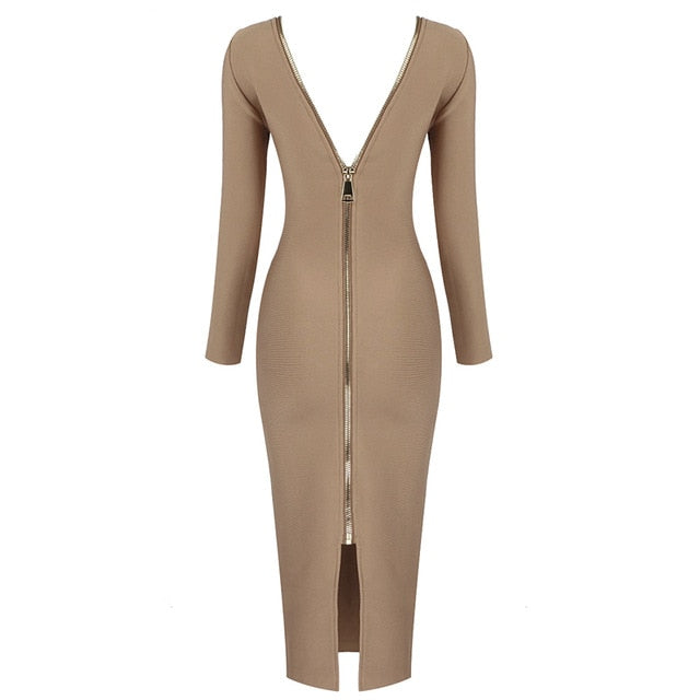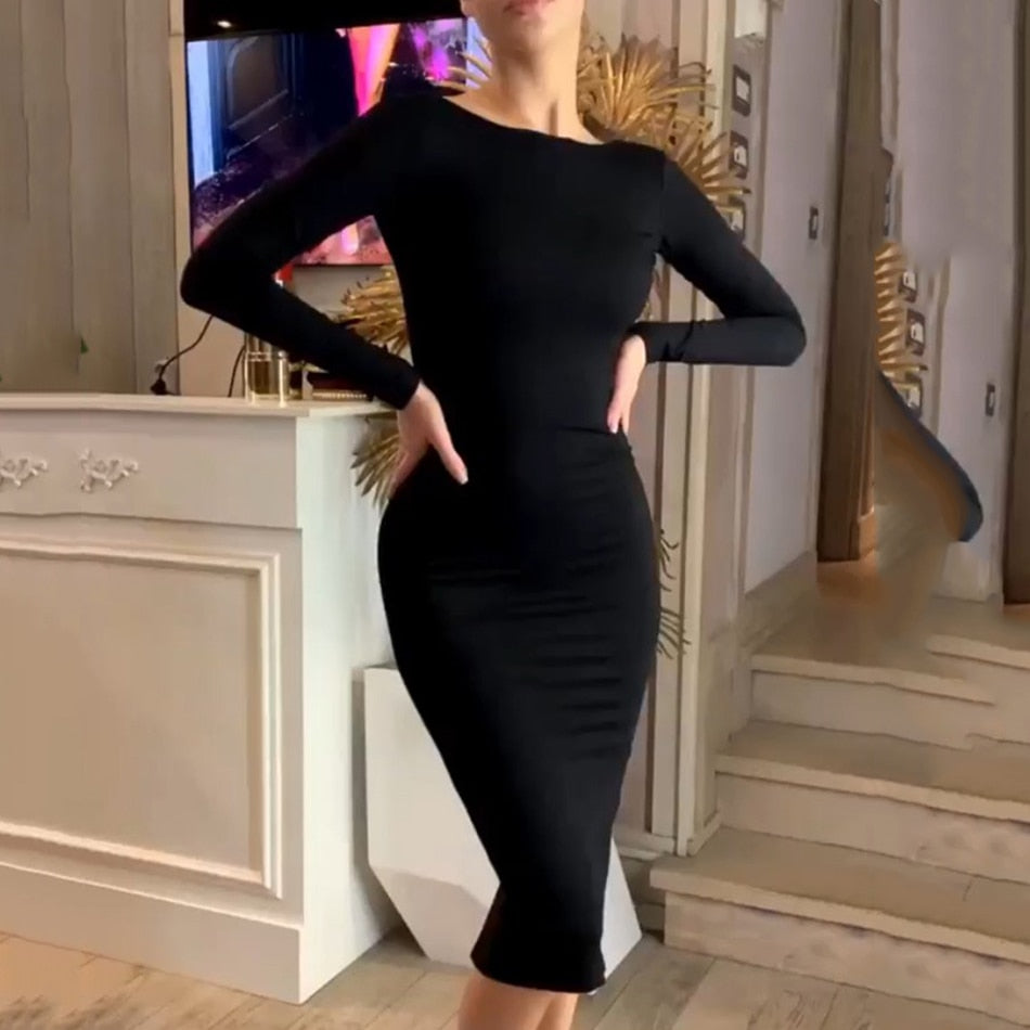 Long-Sleeved O-Neck Collar Solid Spandex Midi Dress with Zipper Closure