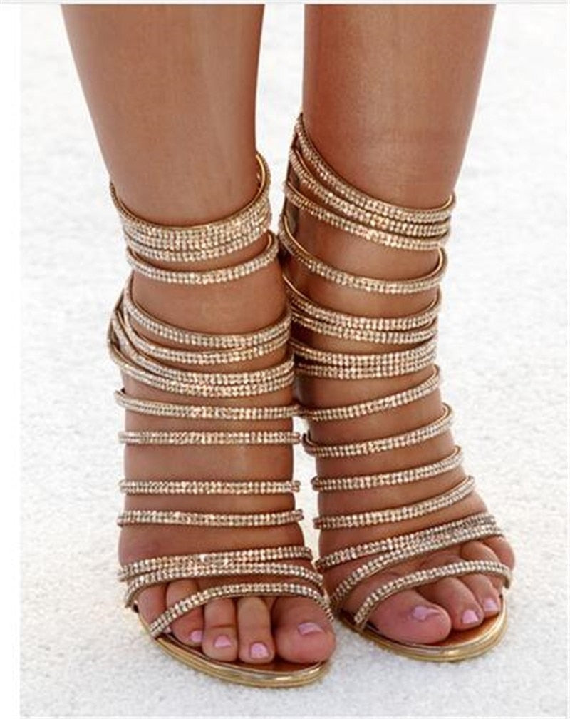 Ankle Gladiator PU Leather Heeled Sandal with Rhinestone Decorated Strap and Back Zipper Closure