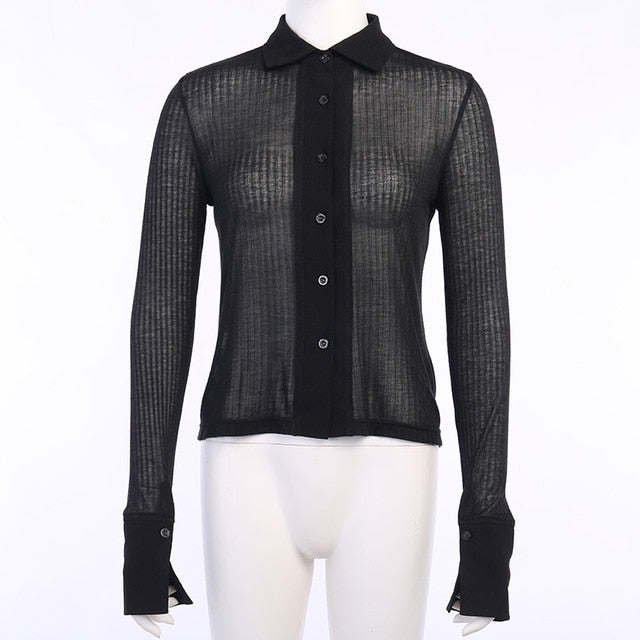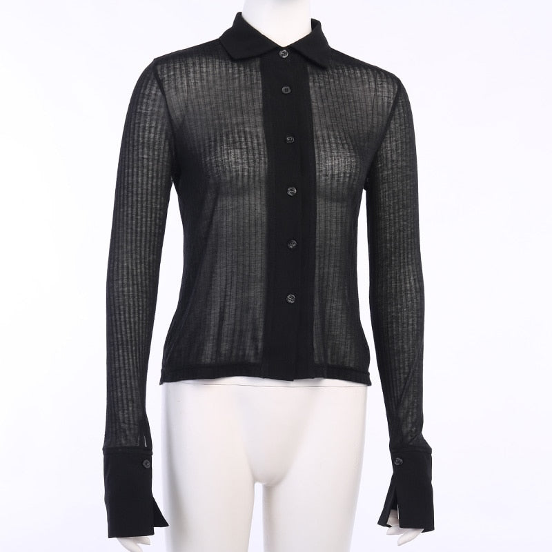 See-Through Long-Sleeved Shirt with Turn-Down Collar and Polyester Material