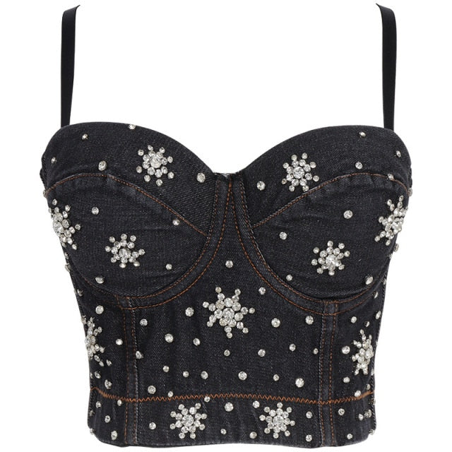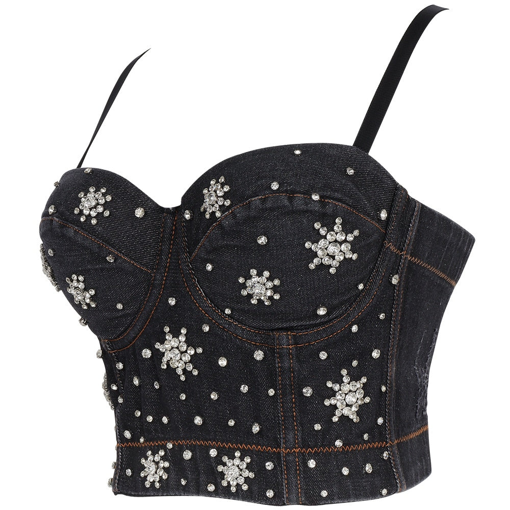 Adjustable Strap Denim Bustier with Snowflakes Beads Decoration