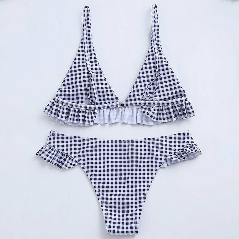 There's no denying that this is a beautiful, feminine bikini with a classic plaid pattern. With ruffles around the waist and cups, this bikini will accentuate any woman's curves. The bottom is a classic high-cut bikini, perfect for showing off your legs.