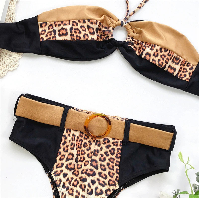 Leopard Printed Bandeau Halter Bikini Set Made from Lycra and Polyester Material