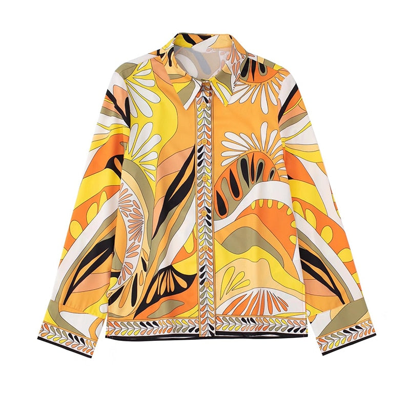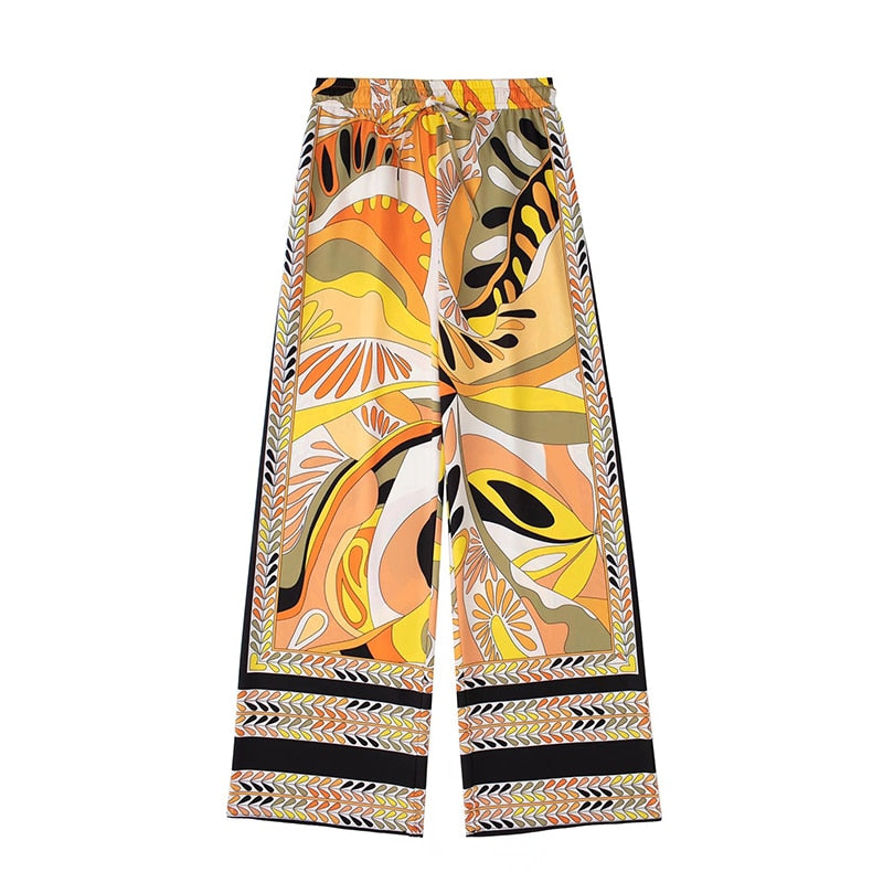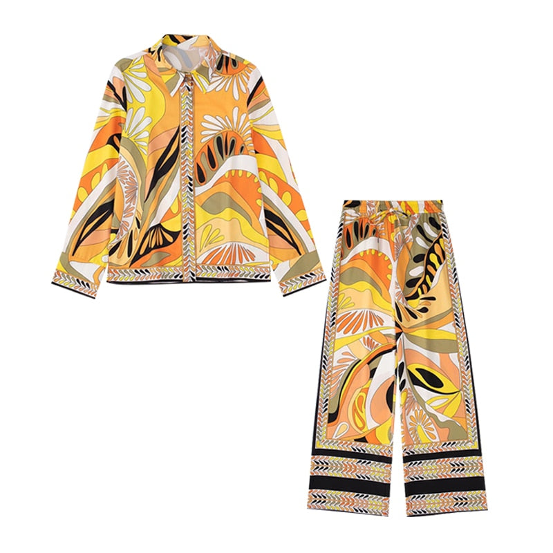 In this cool pant set, the shirt has a feminine cut and the pants are long enough to be worn on their own or tucked into boots or heels. The slim cut of the shirt means it can be styled with virtually anything and the printed pattern adds some fun color to the ensemble. The cool, versatile design is a great way to add a little fashion to your ensemble.