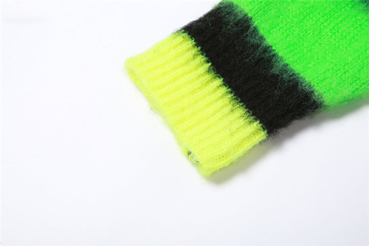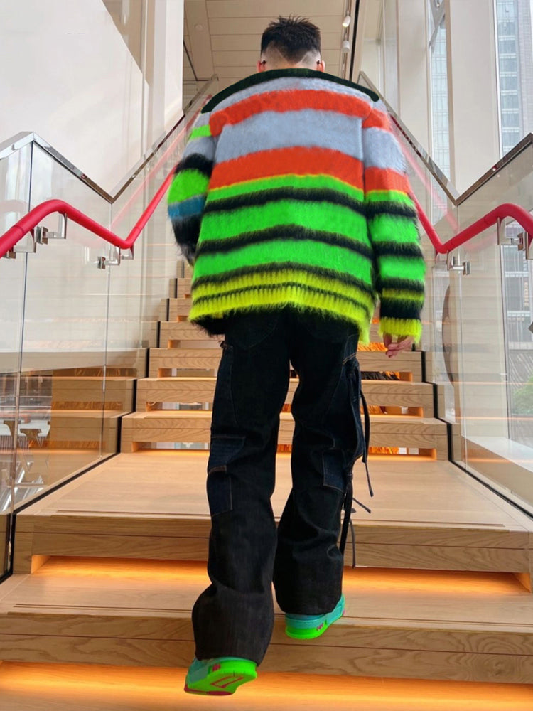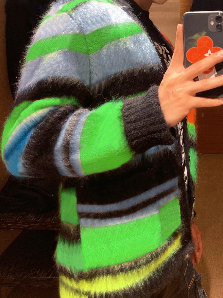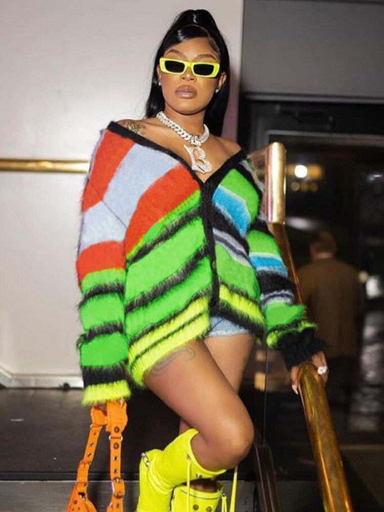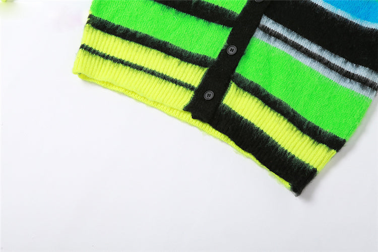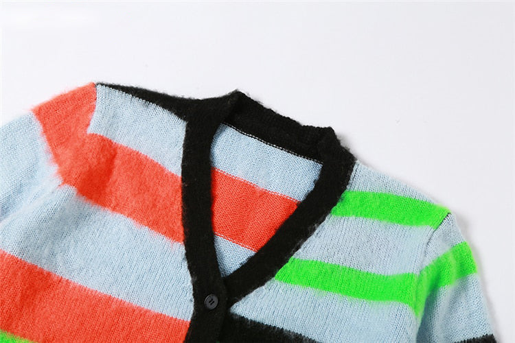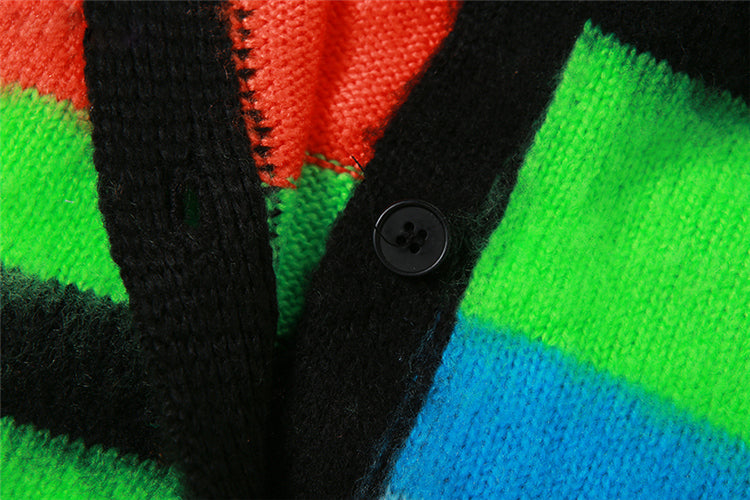 A bright and colorful, single-breasted cardigan sweater with a V-neck and a Patchwork pattern.