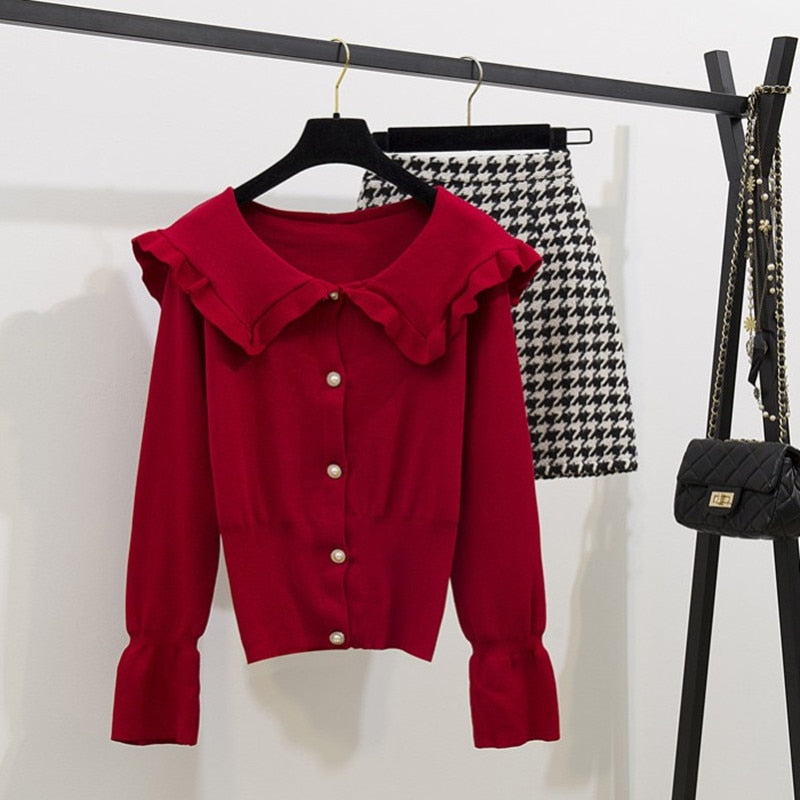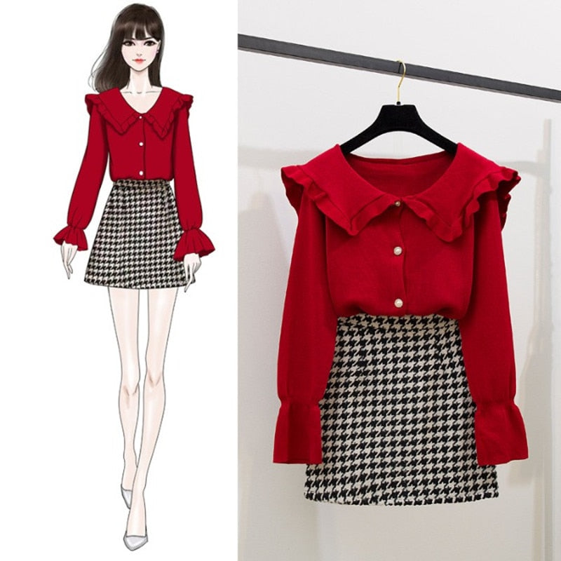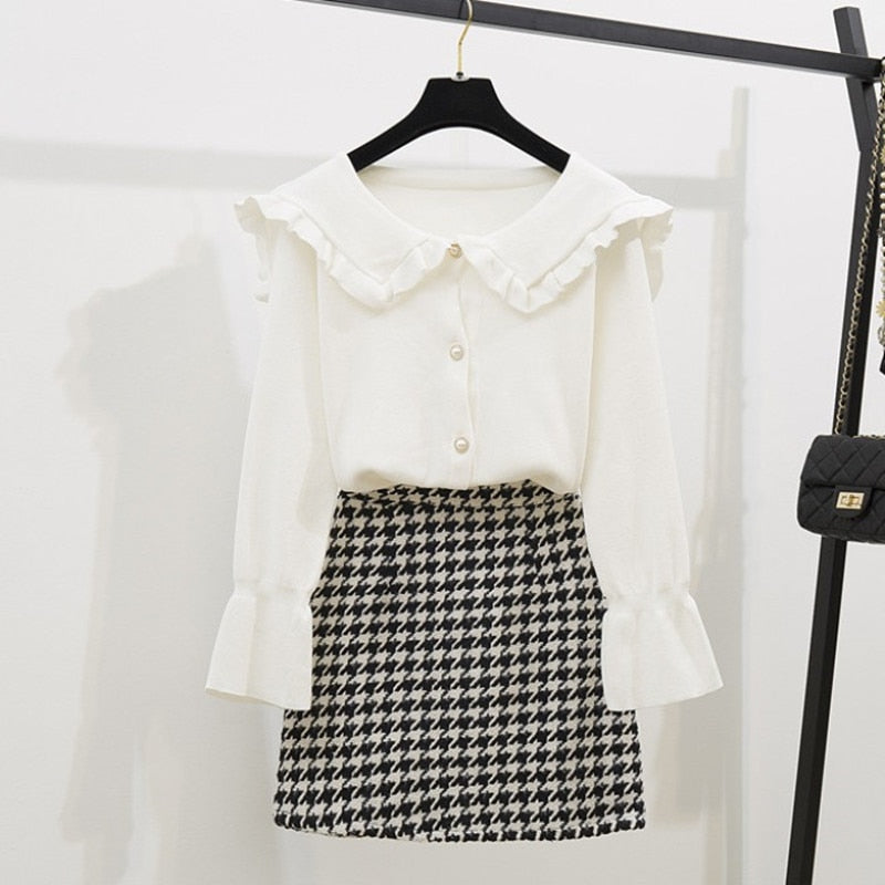 Ruffles Turn Down Collar Shirts and Houndstooth Patterned Mini Skirt with Zipper Fly Closure