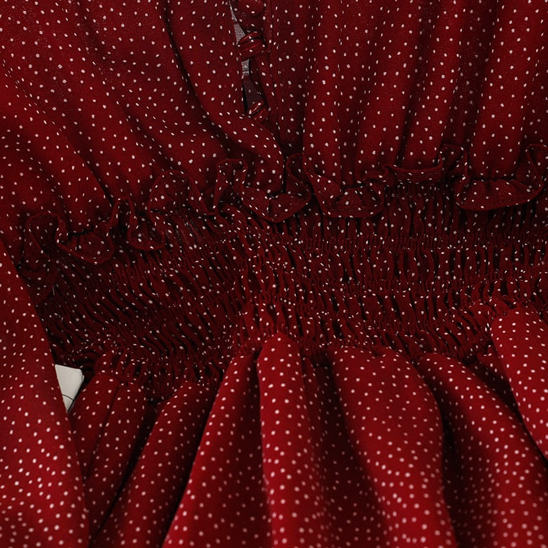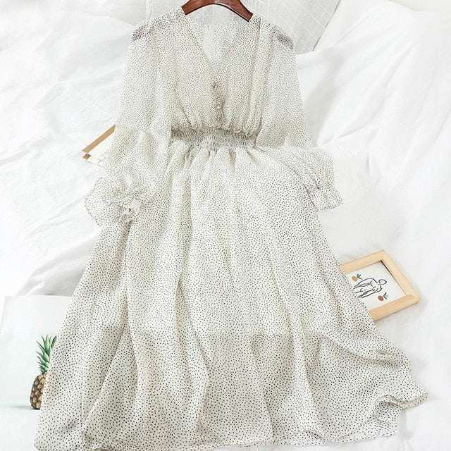 Polka Dot Patterned Midi Dress with Elastic Empire Waist, V-Neckline, and Zipper Closure