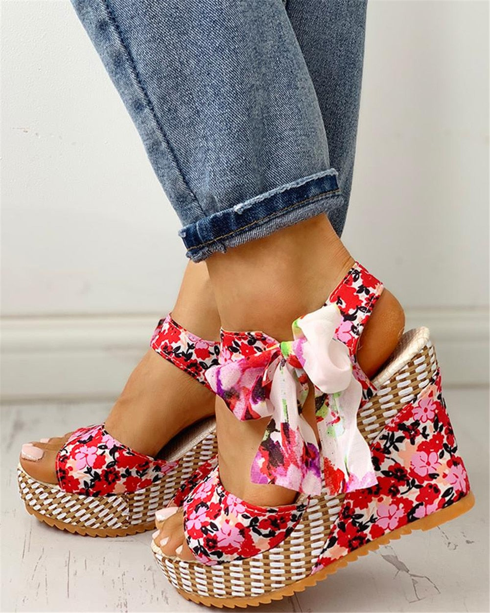 Floral Patterned Microfiber Platformed Wedge Heeled Sandal with Bow Ankle Strap