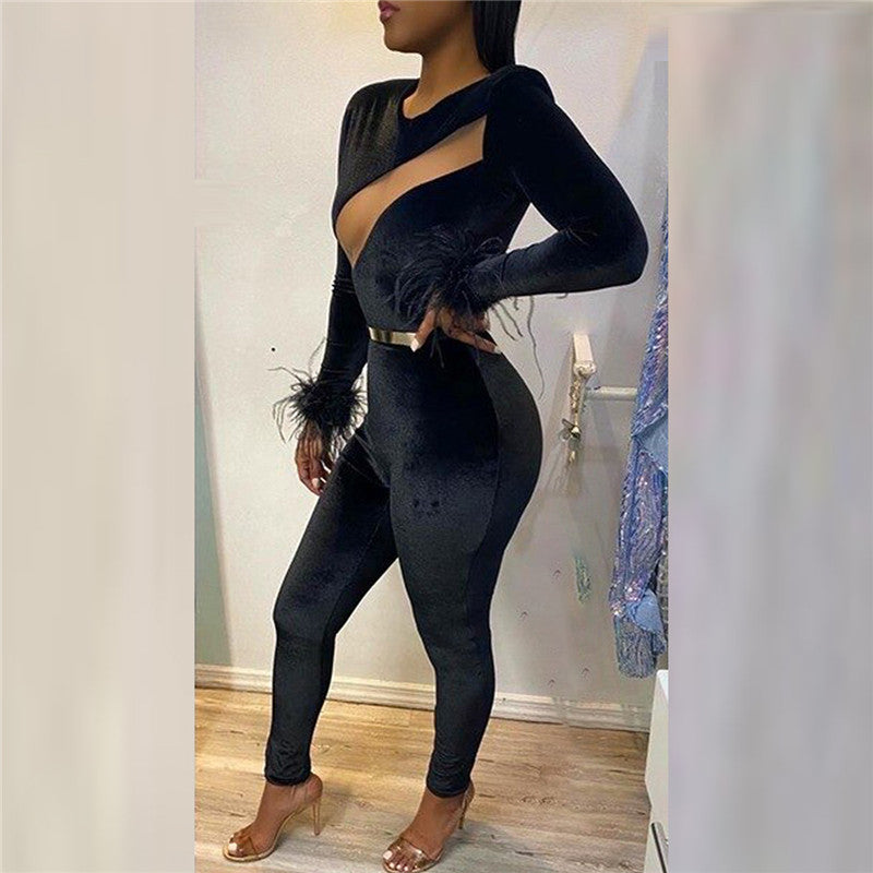 Skinny Fit Jumpsuit with Solid Color, Hollow Out Decoration, and Polyester Spandex Material