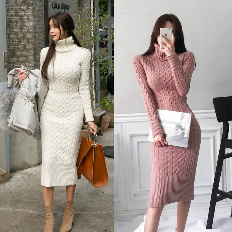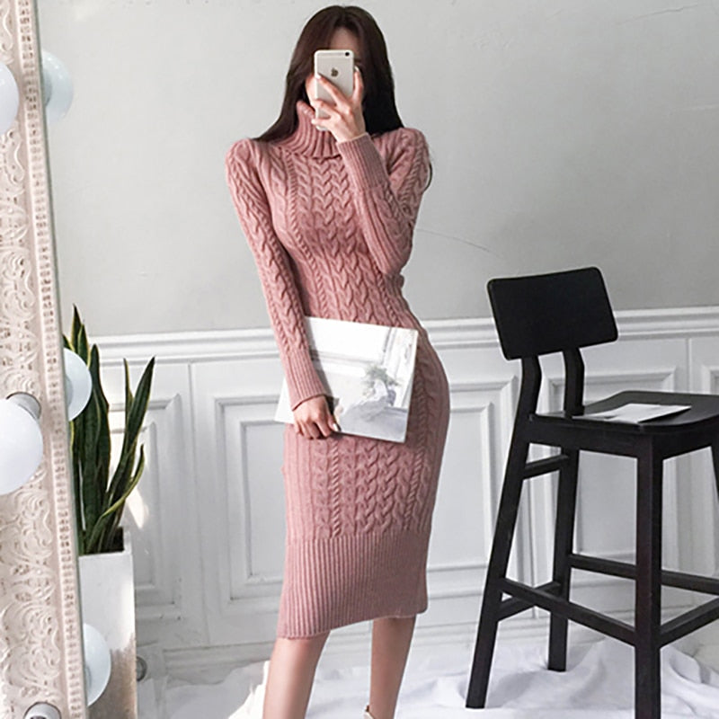 Solid Color Geometric Patterned Midi Dress with Turtleneck Collar, Long Sleeve, and Cotton Acrylic Material