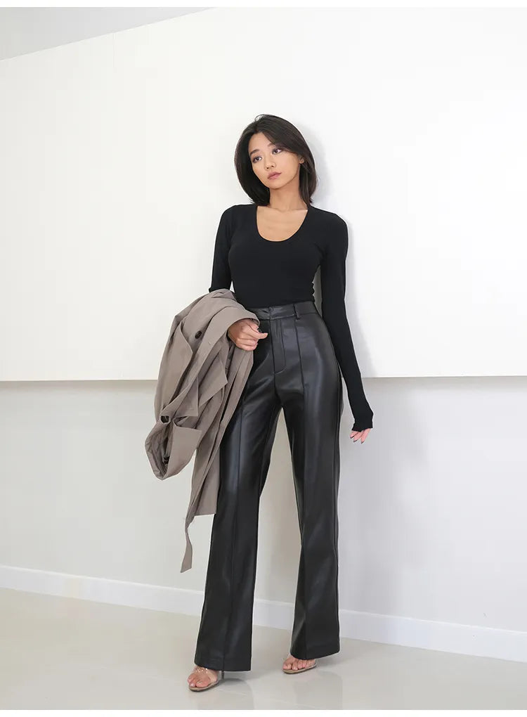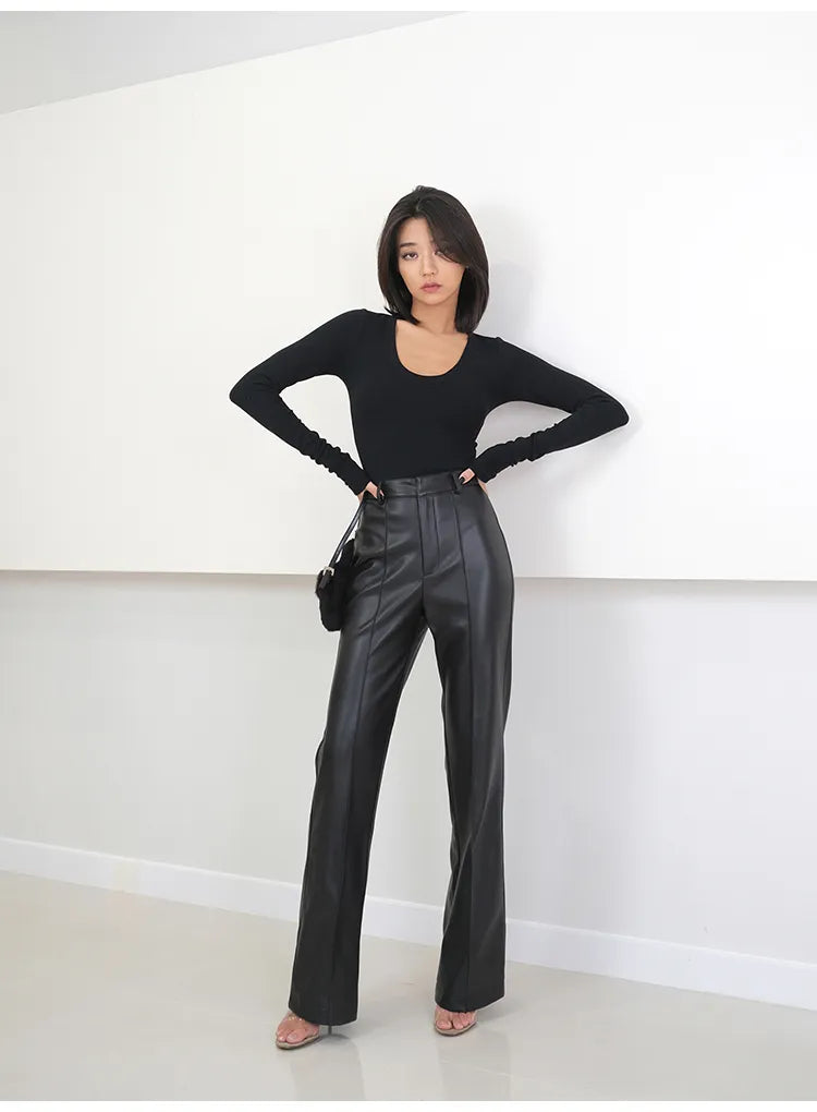 Experience cutting-edge style with these pants. Crafted with faux leather and a solid design, these pants feature a fake zipper for an elevated aesthetic. Create your outfit of the day with this timeless look.
